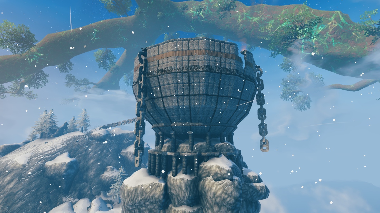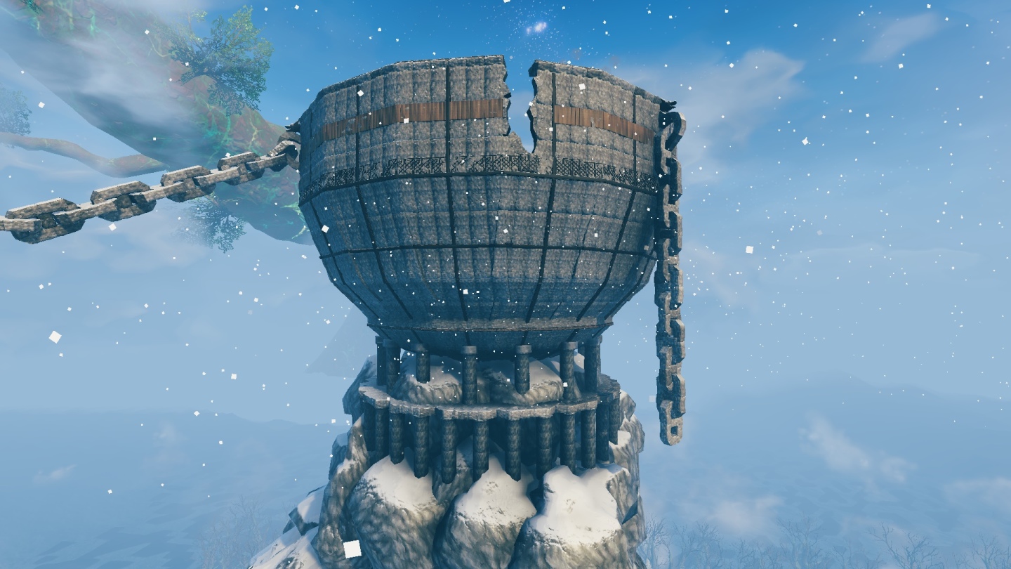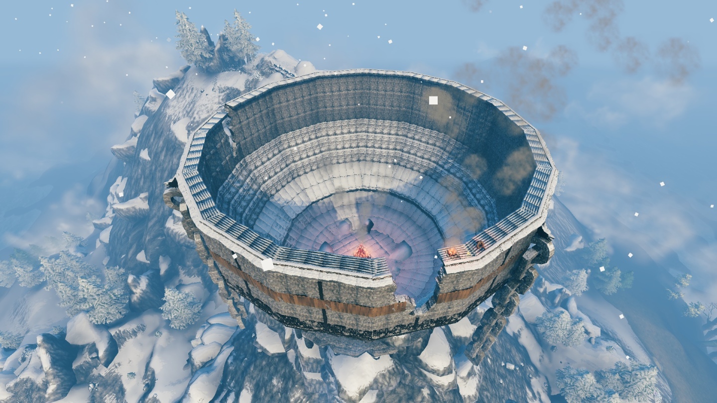 Grrvvpp23 用了「Valheim+」、「Odins Architect」、「Gizmo Reloaded」及「Better Creative」四種模組來進行建造,他回應表示有嘗試用一些方式來打造較高細緻度的爐火樣貌,但只要以較遠的視角觀看就會出現無法正常顯示的問題,所以最後只好單純放置篝火作罷。