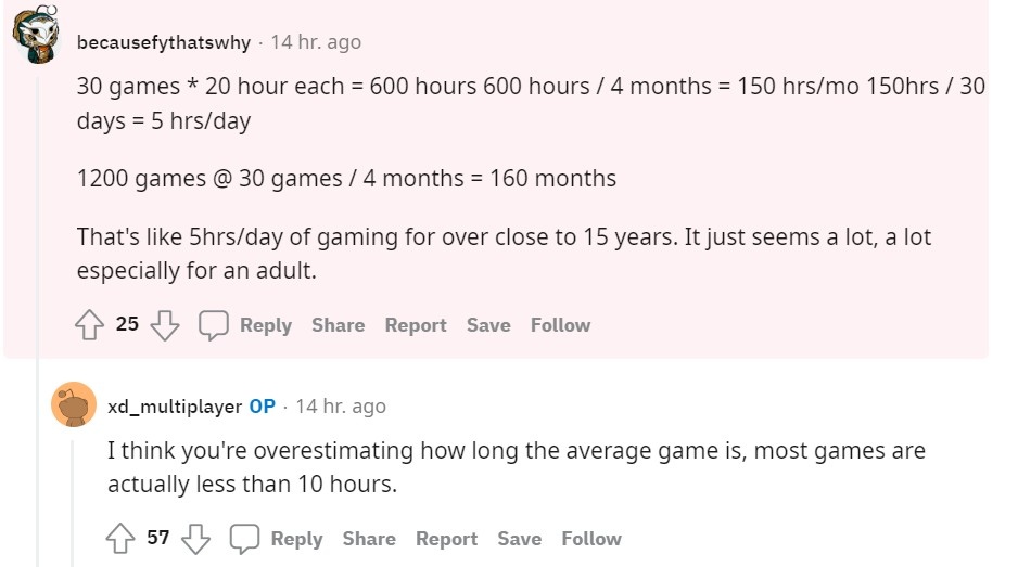 xd_multiplayer 對此表示這估算方式過度高估了一款遊戲所需的時間,表示大多數作品遊玩時間都低於 10 小時