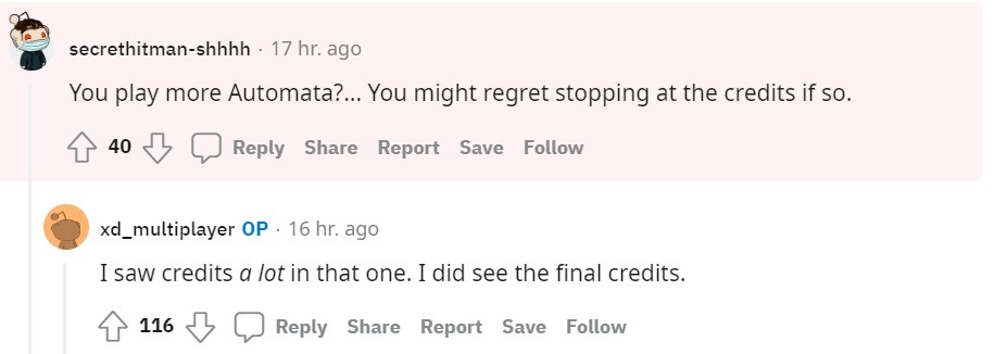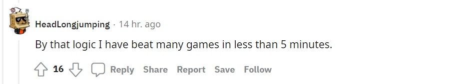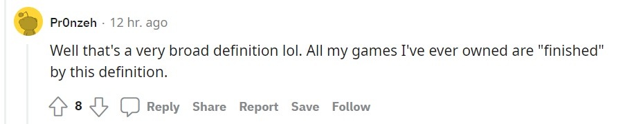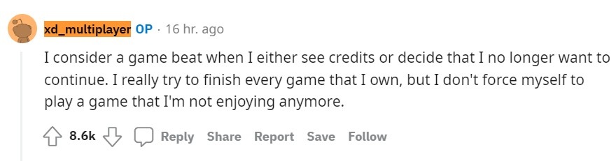 xd_multiplayer 在 reddit 上分享這項成就後獲得了不少玩家的讚賞,至於「玩完」的定義,他表示分為兩種,玩到看完製作團隊名單,以及體驗感到無趣而不想繼續,他補充說到自己是很想玩完所有遊戲,但真的不想強迫自己去玩一個已經感受不到樂趣的作品。