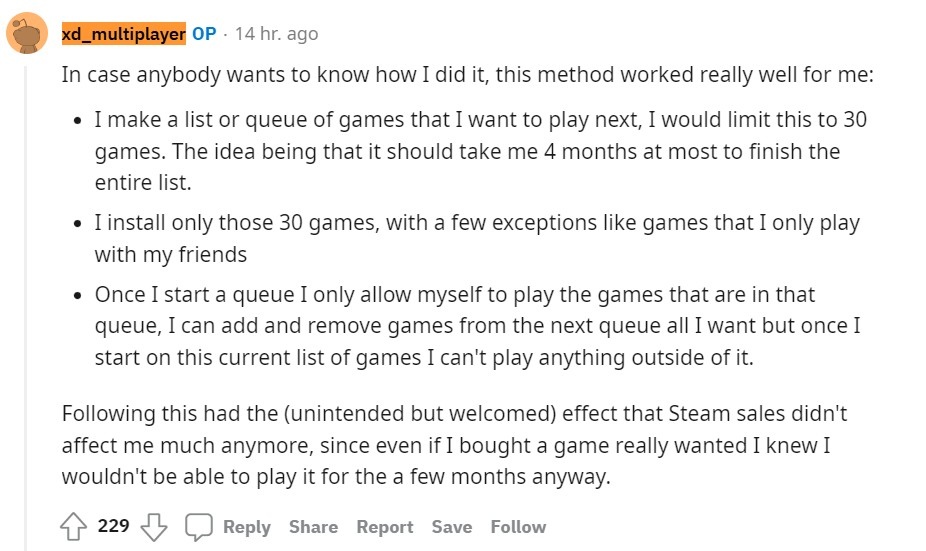 這自我限制的做法帶來了意外的正面效果,因為必須專注在清單上的作品,特賣新遊戲就算入手也要得等上幾個月將清單玩完後才會碰,一旦知道買了不能馬上玩,購買慾望自然就會下降,避開特賣活動導致錢包大失血的狀況。關於如何整理收藏庫未玩作品?d_multiplayer 也在貼文上給予了說明。