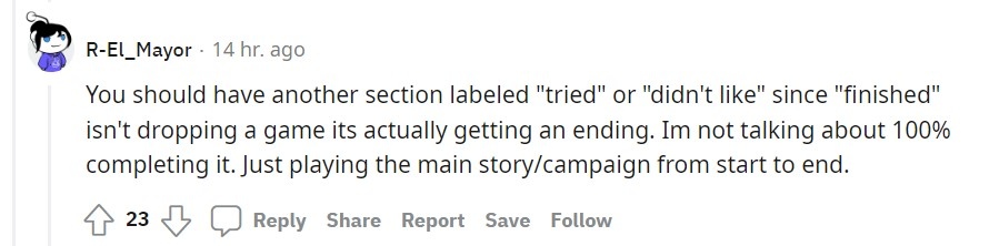 有玩家認為要多用個「嘗試過」的清單作更詳細的分類,認為中途棄坑不能算是玩完一款作品