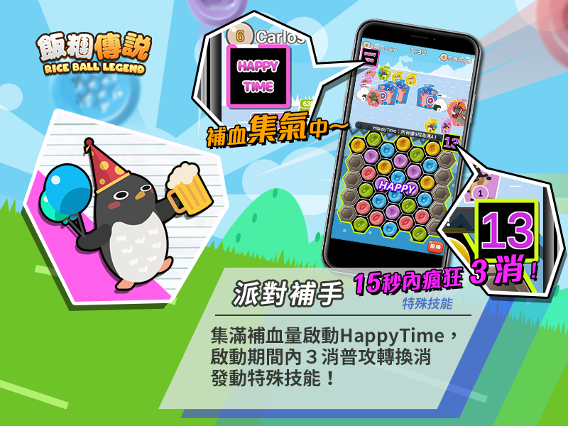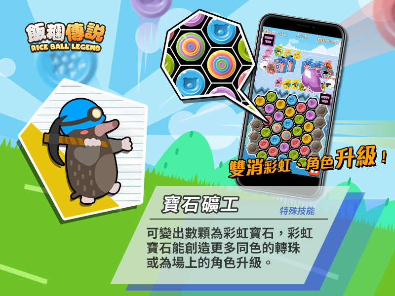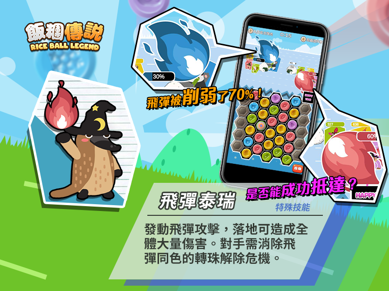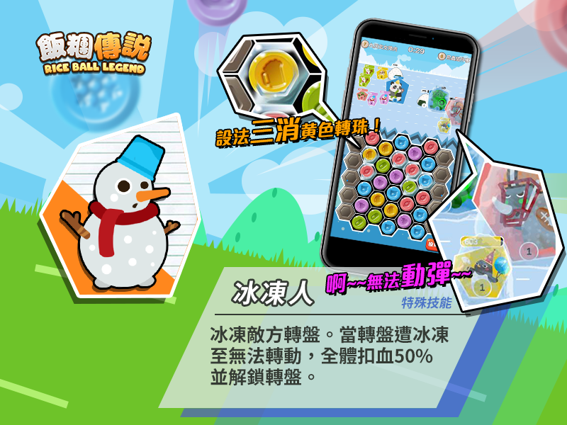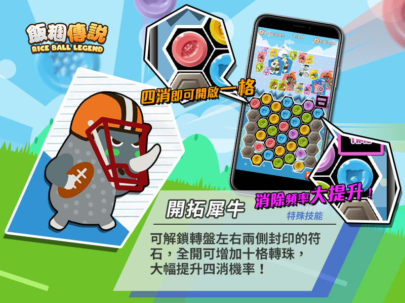《飯糰傳說》精心為每張卡牌設計了獨特的技能,在轉盤消除的位置、或在戰場上的順位都能發揮不同的技能。譬如在轉盤上方消除轉珠可加成『 刺龜』的攻擊力、『開拓犀牛』則可以解鎖兩側封印的轉盤,增加十格轉珠的位置,大幅增加發動 4 消的機率。