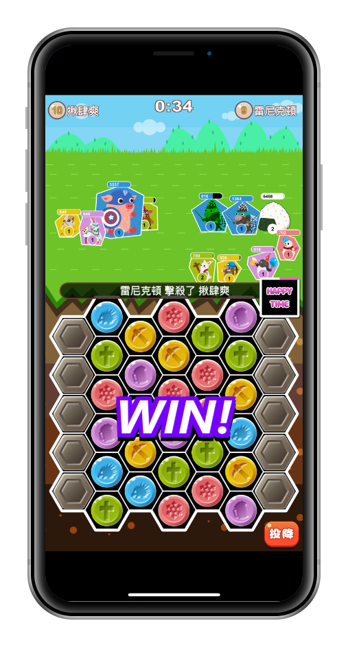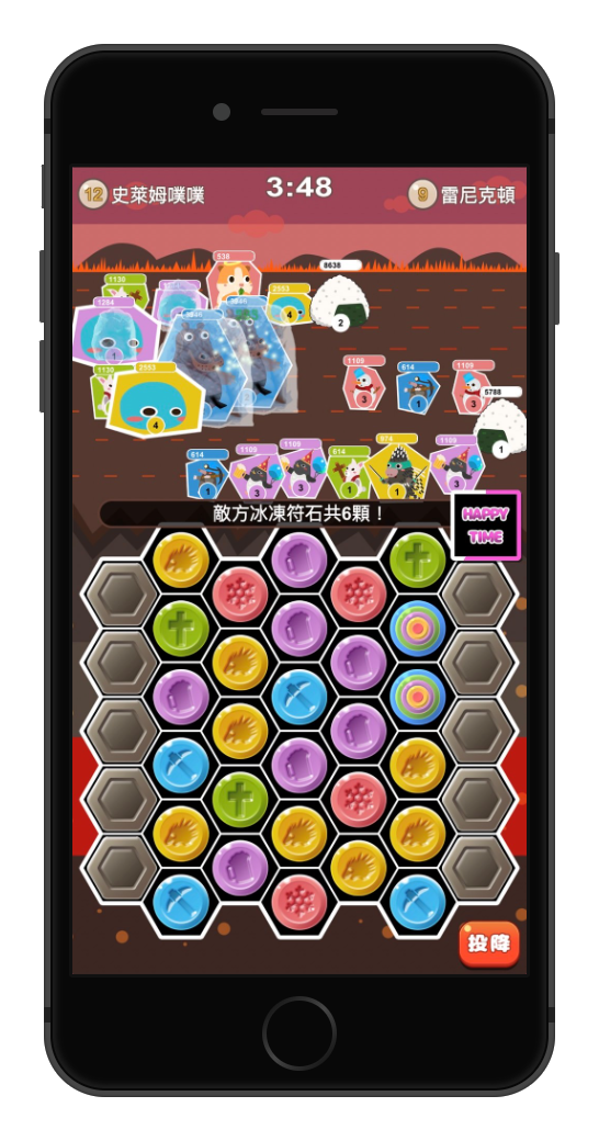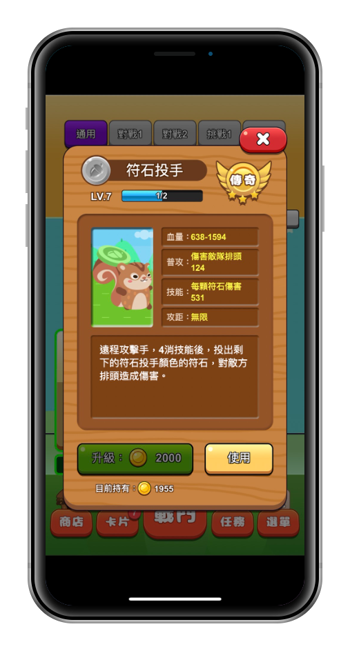 此外,每隻角色有自己的攻擊距離,有些近戰需要消除對應顏色才能進入攻擊區如 『毒斧蠻兵』、有些則是每次消除轉珠都會自動前進一格的衝鋒角色『坦克殺手』。遊戲中還有很多別具特色的卡牌,等玩家慢慢蒐集體驗囉!