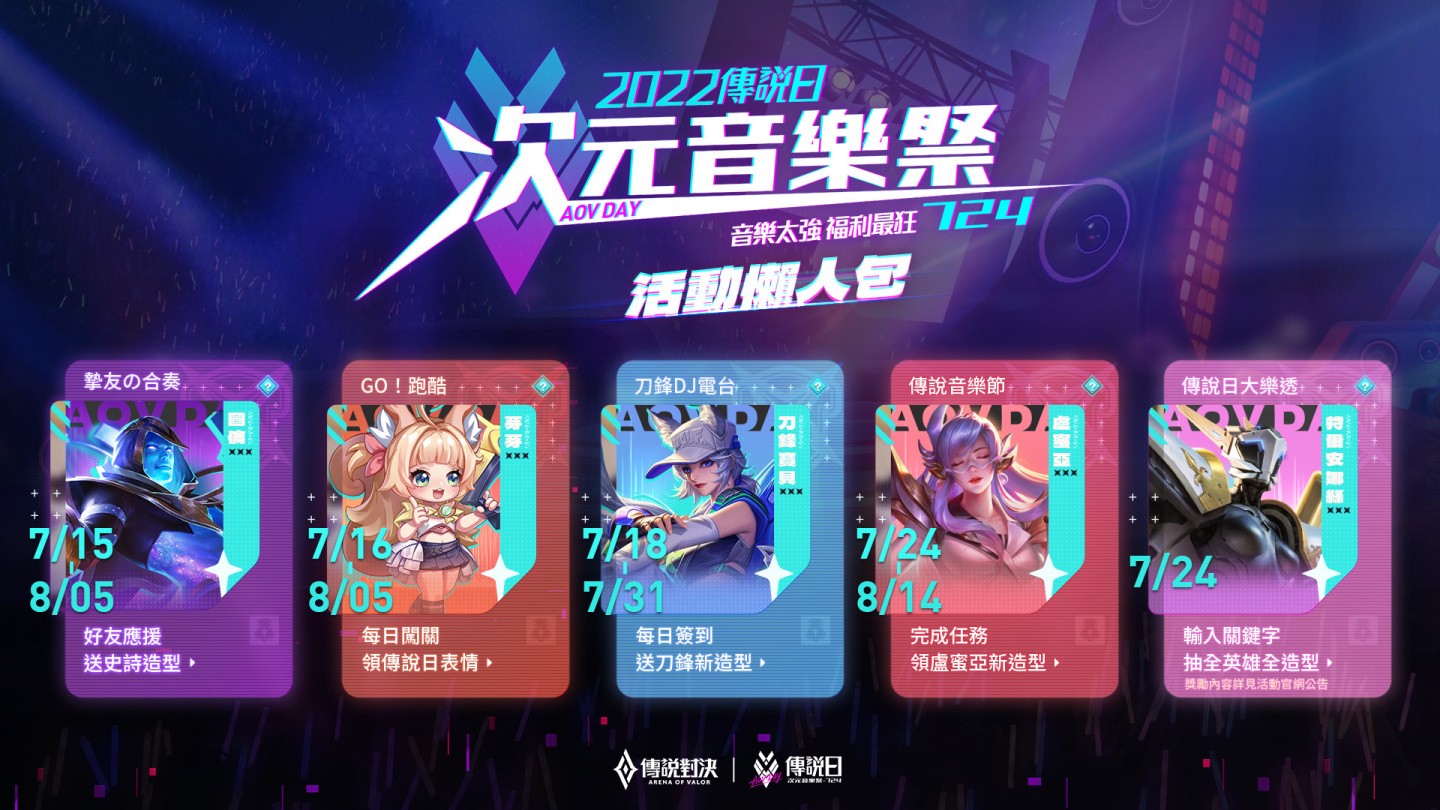 另一方面,2022傳說日也從今天開跑,一路到八月底有超多超狂福利等玩家來同樂。只要在7月18日參加刀鋒DJ電台,每日簽到就送刀鋒寶貝新造型「動物派對」,完成傳說音樂節任務,再加碼送盧蜜亞新造型。此外,在7月24日當天,史上最狂的傳說日大樂透也將登場,只要在聊天室輸入關鍵字就有機會抽到全英雄全造型,前所未有的豐富福利都在傳說日與玩家一起歡慶次元音樂祭!