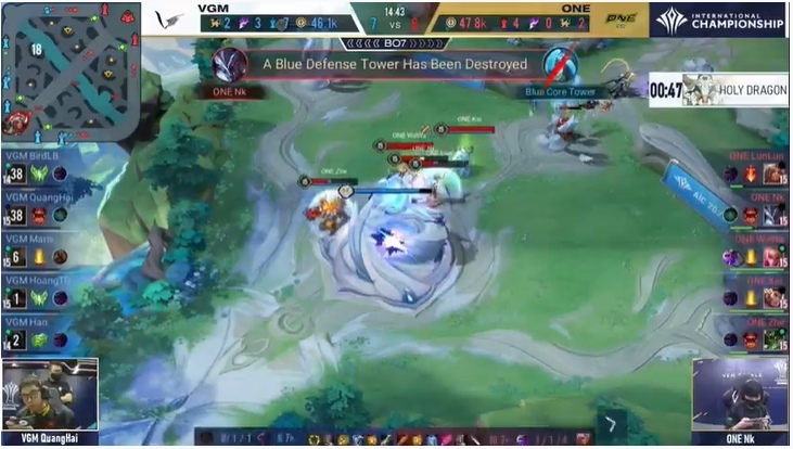 第三局VGM 延續上場勝利氣勢,魔龍輸出位的HoangTD 選擇以發育屬性的射手拉維爾應戰;而ONE 則改變策略以亥犽與綺蘿的陣容迎戰。遊戲前期魔龍路兩波碰撞,ONE 雖然獲得本場首塔,但後續隊友並未跟上深入敵陣的 WaWa 的洛里昂,使得 VGM 得以一路直逼 ONE 高地塔。同時,本局拿出成名角神力女超人的 QuangHai 表現相當亮眼,屢屢衝散 ONE 陣線並配合隊友後續補上的輸出,造成 ONE 團戰不斷處於下風。本場最後雙方在高地經歷一陣周旋之後,VGM 突破 ONE 的防線再次獲得本場勝利。