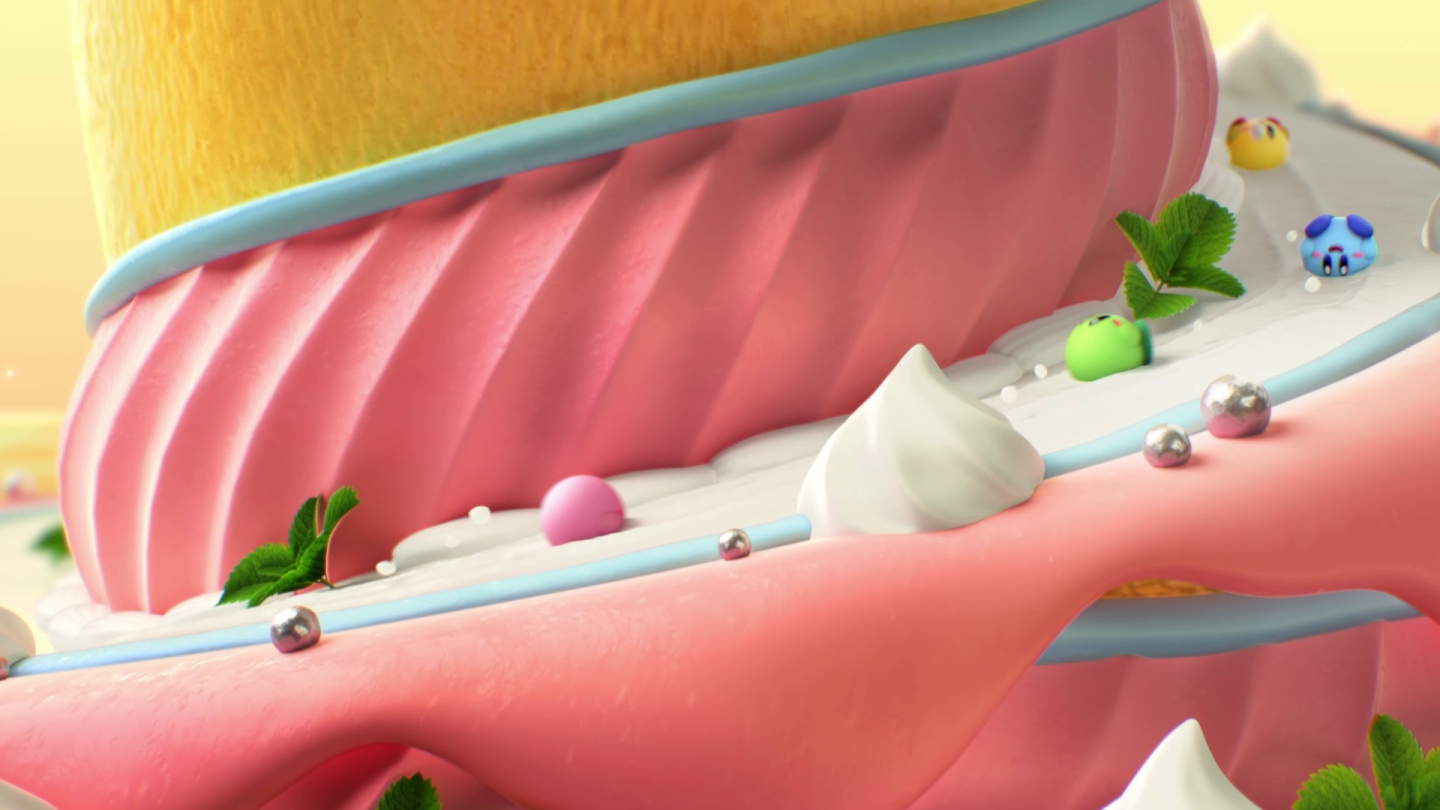 到達了美食節會場的卡比,還未等到節目開始,就想吃蛋糕。沒想到當他即將要開始吃的瞬間,卻因為不可思議的叉子的力量而讓身體變小了。剛才的蛋糕,變成大到吃不完的模樣。而且彩色的卡比也變小,一起掉下來了。卡比們為了肚子飽飽地盡情享受這個點心世界,互相競爭開始滾動。