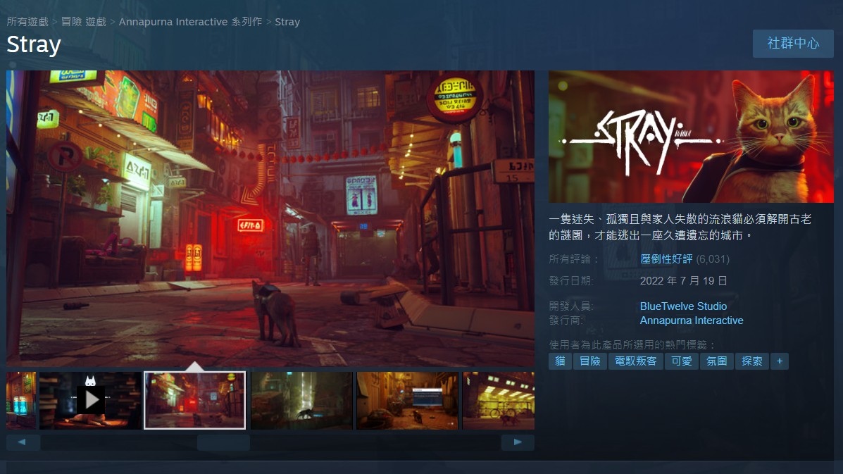 《Stray》是由 BlueTwelve Studio 所打造的動作冒險作品,以貓的視角在 Cyberpunk 風格的都市中漫遊冒險,進行解謎闖關外,也透過小機器人「B-12」互動了解整個都市的種種小故事。近期更於 Steam 平台直接拿下了壓到性好評的成果。