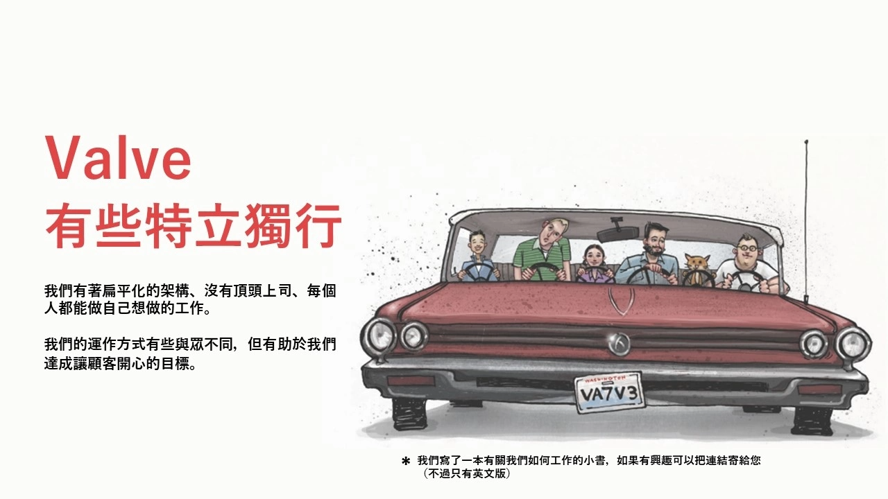 Va;ve 沒有採用一般公司從上到下的典型結構,沒有發號施令的人,每個員工也不是聽命行事,在此每位員工都為使用者做出最有價值的付出,並相信這樣的方式,能達成目標,盡可能的讓每個使用者都滿意 Valve 的服務,
