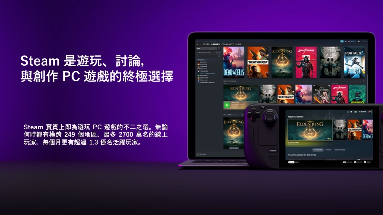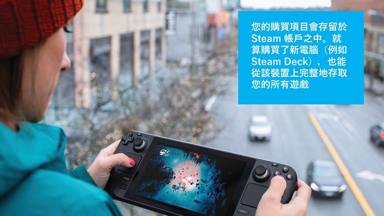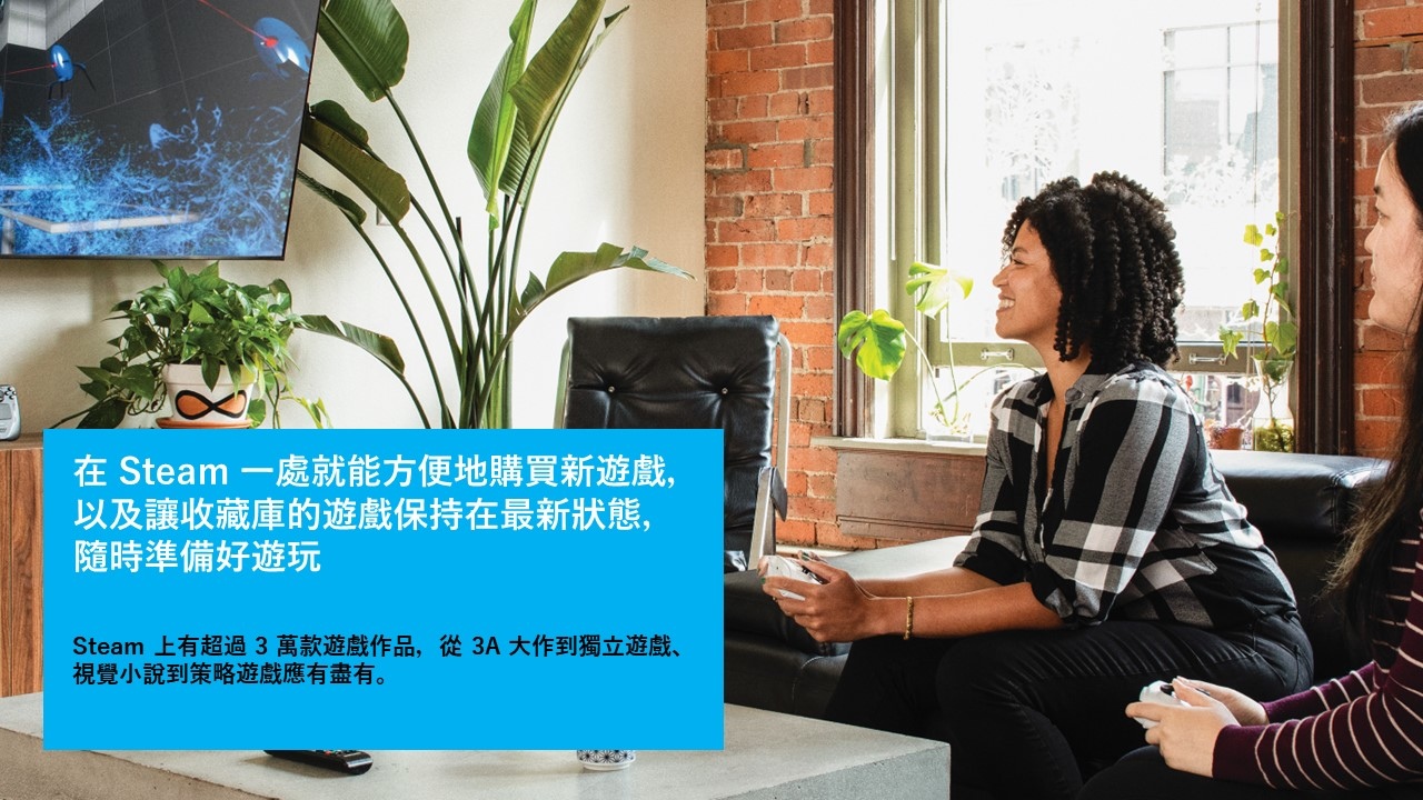 在 Steam 上不只讓買遊戲變簡單,更確保能持續遊玩購買的遊戲,目前已有超過 3 萬款在 Steam 上推出的作品、來自不同平台,從小型獨立作品到 3A 大作。每個用戶購買的遊戲都綁定於帳號,不管哪台 PC 都可登入下載並遊玩。購買 Steam Deck 的玩家帳號內若有先前購買的遊戲即可直接遊玩,同樣在 Steam Deck 上購買遊戲的玩家,也可在 PC 玩不被任何硬體限制,適用未來更新的 Steam Deck 版本。
