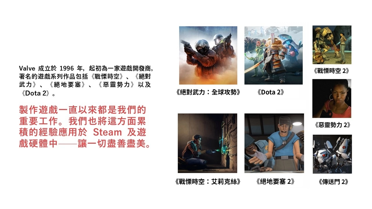 誠如玩家所知,Valve 創立於 1996 年,還是主要設計電子遊戲的公司、但到了現在也在開發硬體並經營遊戲平台 Steam。Valve 這些年來造出不少遊戲,像是《絕對武力》、《Dota》、《戰慄時空》、《惡靈勢力》、《傳送門》等等。這造就了創作遊戲不僅是 Valve 的核心,也是最熟悉、投入最多心力與時間的項目,因為創作並了解遊戲,因此在 Valve 相信能在硬體與 Steam 平台上能有更強大的表現,