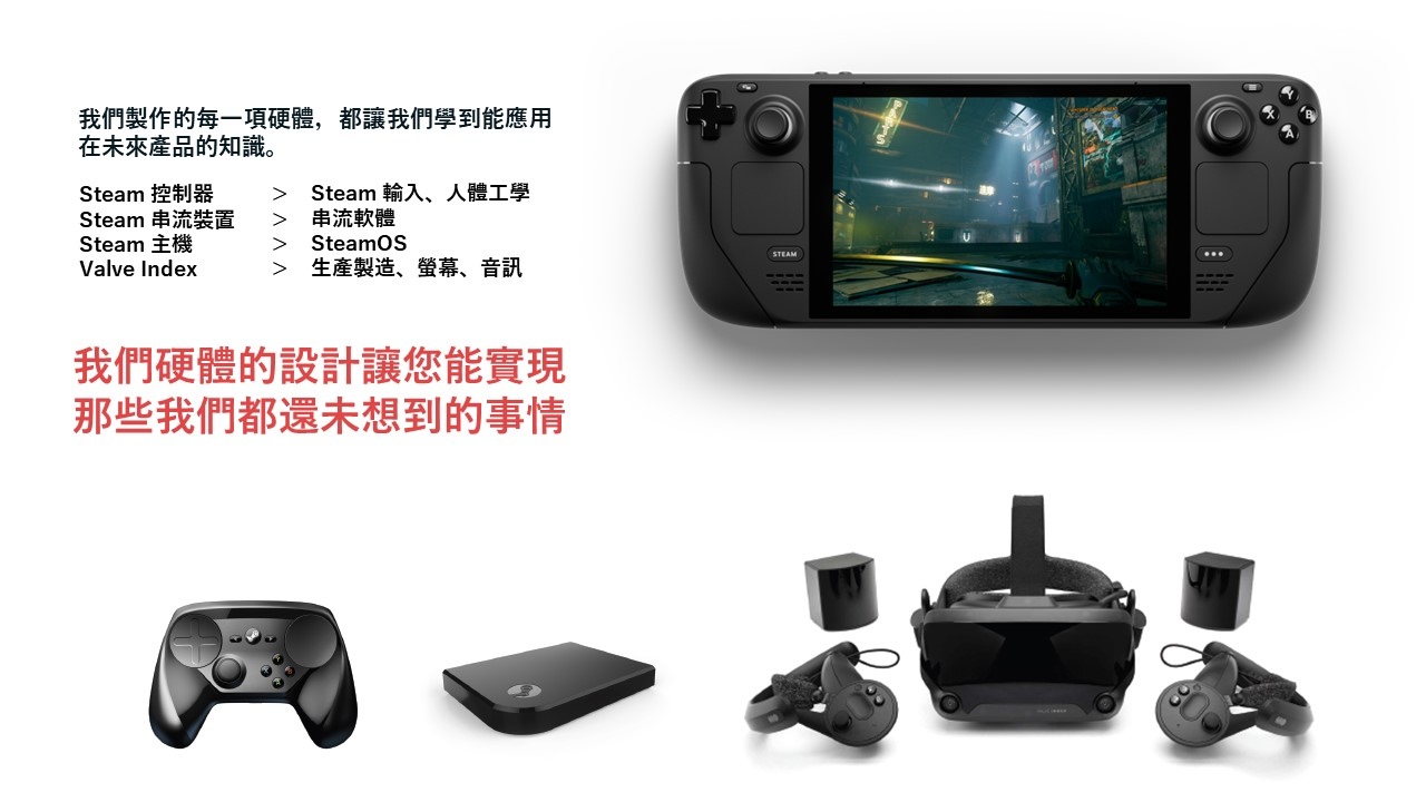 同樣地, Steam Link、Steam Machine 以及在虛擬實境方面的深耕,帶給團隊關於顯示技術、操作系統和各式各樣的專業領域知識,如今都體現於 Steam Deck 中,Valve 硬體的設計思維是希望能對 Steam 玩家的遊戲體驗,產生一些可能性的改變,由於一直努力拓展 Steam 遊戲體驗的可能性,也因此才會投注心力在硬體上。