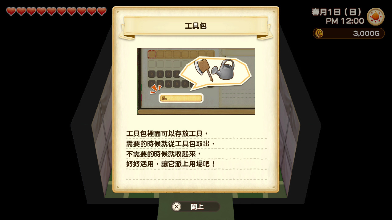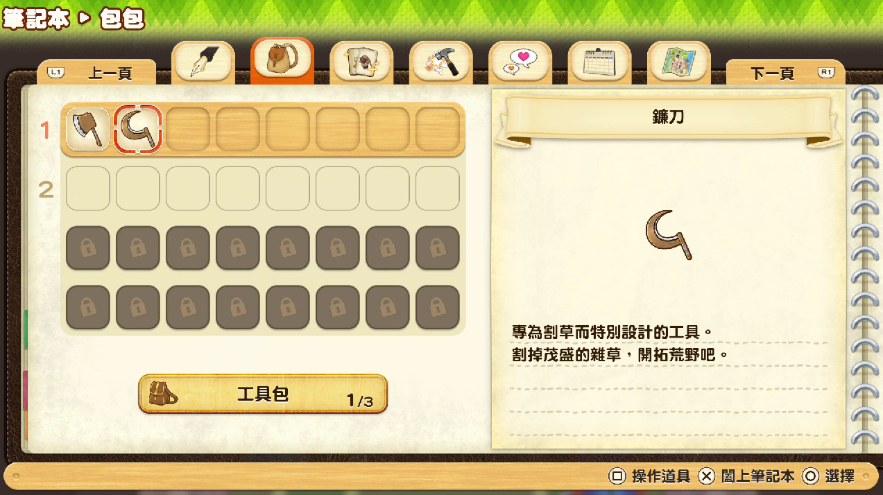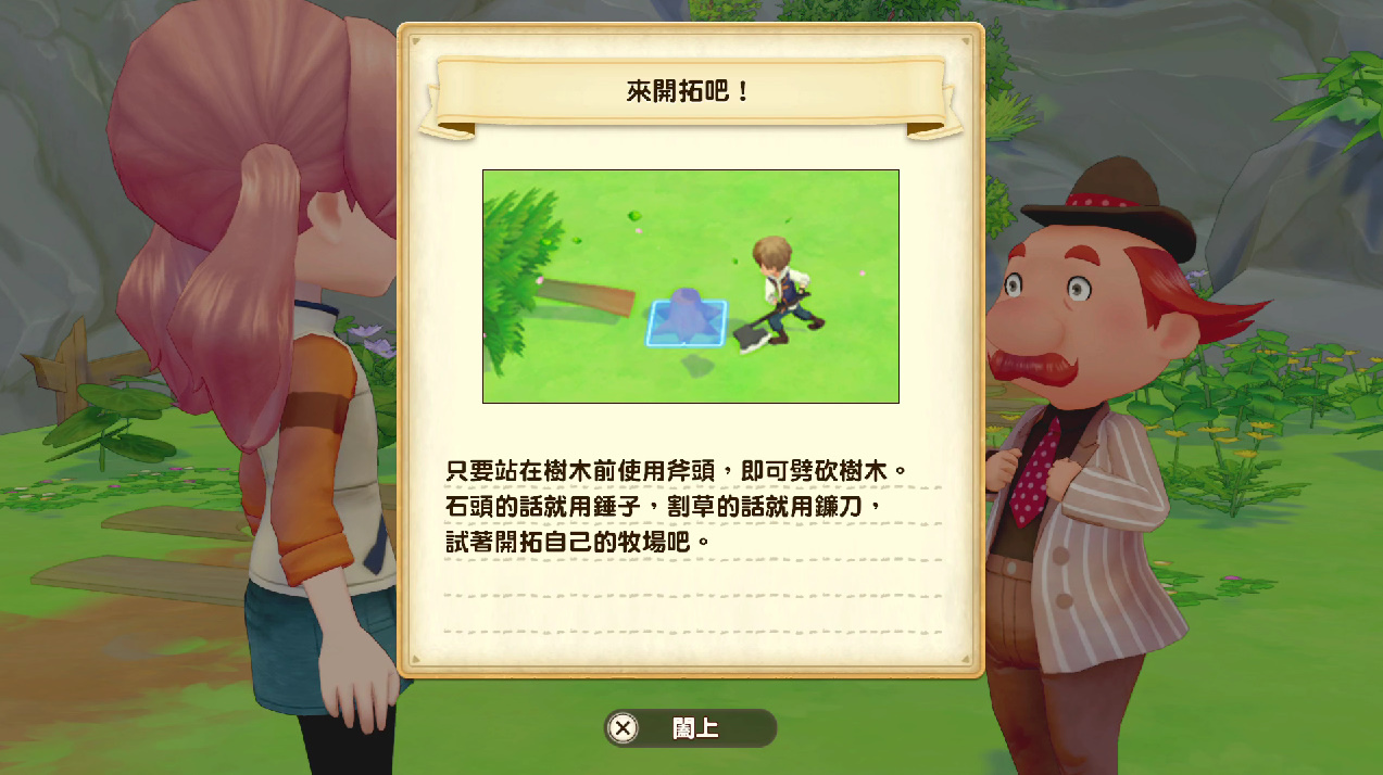 遊戲中會使用到不同類型的工具與道具,像是斧頭能拿來砍樹、鐮刀用來割草、槌子能用來敲打石頭等等,都是牧場生活中不可或缺的工具,隨著遊戲進度總共會取得九種基本工具,只要將工具放在道具欄就能夠使用,當有一定程度的素材和金錢後就能把工具升級,讓開拓牧場的工作變得更加順利。主角一開始所在的區域只是龐大牧場的一小部分,當連接的橋樑修好或打通被巨石堵住的地方就能擴展到下一階段的區域,能採集到的道具種類也會增加。