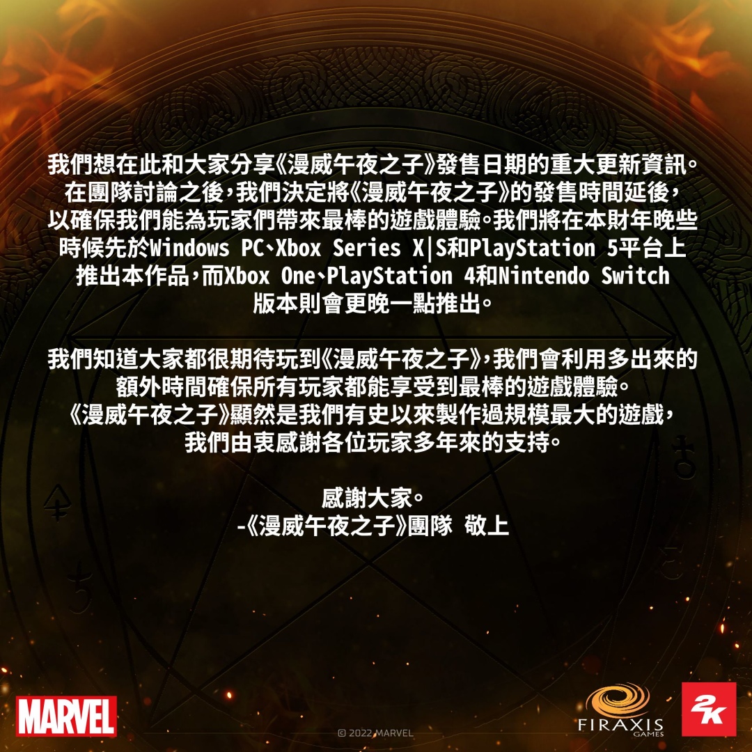 2K Games 原本預定 2022 年 10 月 7 日起在 PS5/PS4/Xbox Series X|S/Xbox One/Nintendo Switch/PC(Steam/Epic Games Store)平台發售、Firaxis Games 開發的戰略 RPG《Marvel's Midnight Suns 漫威午夜之子》,宣佈遊戲將會再度延期推出,預估最快也會是 2023 年 4 月以後才會發售?而這也是本作第二次的宣布延期。