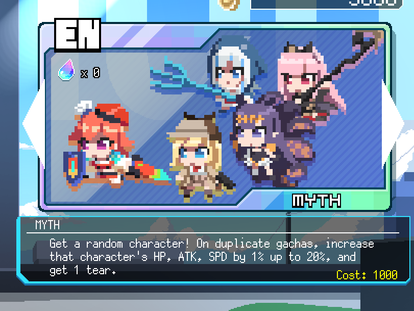 8 月的更新中除了追加新角色、新武器與新場景以外,預計在轉蛋系統中新增「Gambler's Tears」機制。當玩家想透過轉蛋獲得重複角色時就會得到一個 Gambler's Tears,累積滿七個或更多就能兌換,從對應的角色池裡選擇想要的 Hololive 成員。