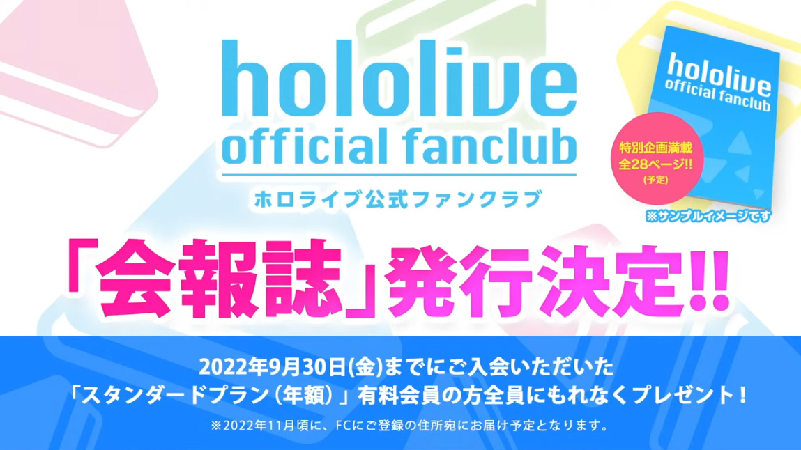 而在 Hololive 官方粉絲俱樂部的泳裝亮相會(部分內容免費)上,揭露了蘿蔔子、赤井心、尾丸波爾卡、拉普拉斯.達克尼斯、亞綺.羅森塔爾、寶鐘瑪琳、癒月巧可、白銀諾艾爾換上新泳裝的模樣;此外也宣布將在今年 9 月底發行第一本「粉絲俱樂部」會刊,只要加入俱樂部並購買標準計劃的粉絲就能直接獲得。