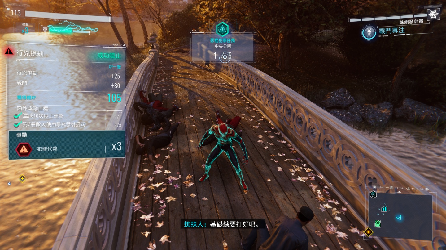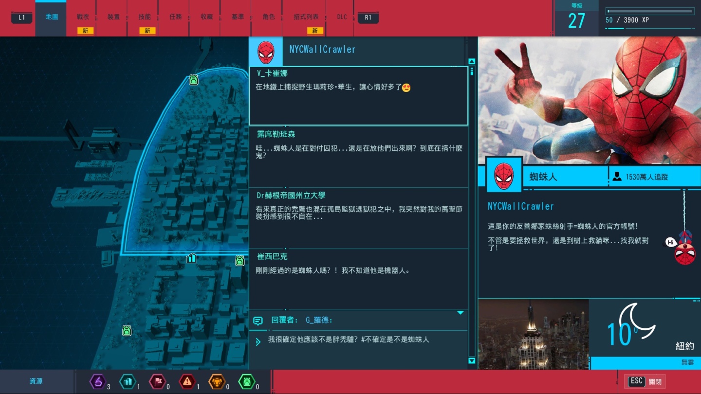更有收集要素如背包設計上,基於本作是 23 歲蜘蛛人「彼得」,從散落各地的背包中可以窺見從高中生初次成為蜘蛛人,到成為大學研究生中間的經歷,整個紐約市更基於玩家探索行動會給出媒體與社群帳號回饋評價。當然少不了彼得周遭遇見的親朋好友,合作夥伴的的拌嘴通話內容,即使都 23 歲,彼得依然管不住自己的碎嘴。