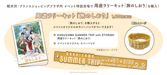 周遊活動「KARUIZAWA SUMMER TRIP with ST☆RISH」可以隨著劇中成員們去過的景點一一造訪,如輕井澤王子購物廣場、輕井澤農特產中心、白絲瀑布等,一共有九個景點,可以聽到限定語音外,集合各地的 Keyword 解開最後一個任務,便可以獲得特別的貼紙。企劃起點輕井澤王子購物廣場可以購買參加組合「旅遊概要」,也有販售其他相關周邊商品,8/19 起開放線上購買。