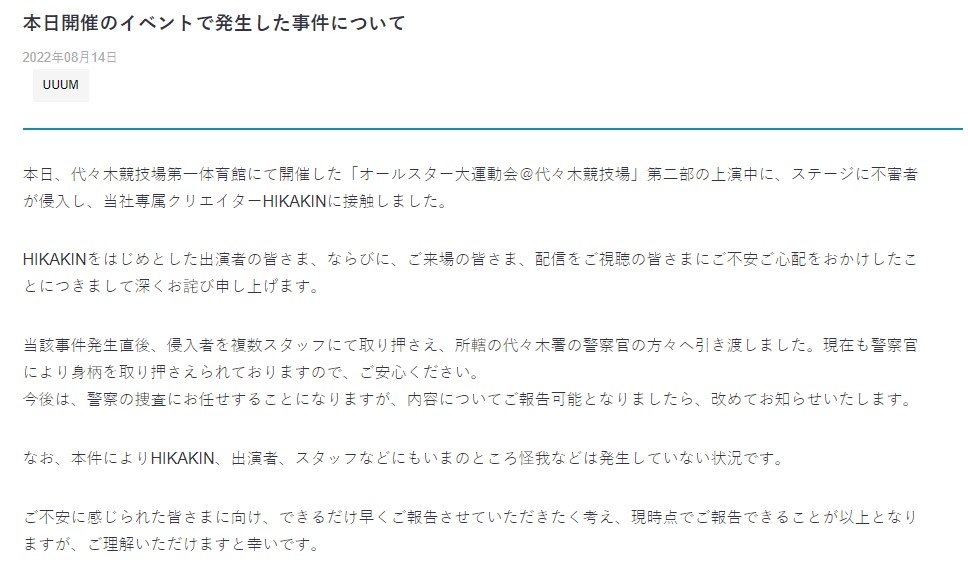 對此 UUUM 於當天發布公告,針對此事件向 HIKAKIN、其他參加者和觀眾致上最高的歉意,並表示事發後工作人員已抓住該男子並移交到代代木警局,警方已介入調查;而 HIKAKIN 本人也在推特上發文表示自己只是受到驚嚇,並未受到任何傷害,請觀眾與粉絲們放心。