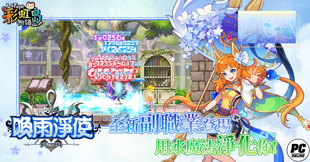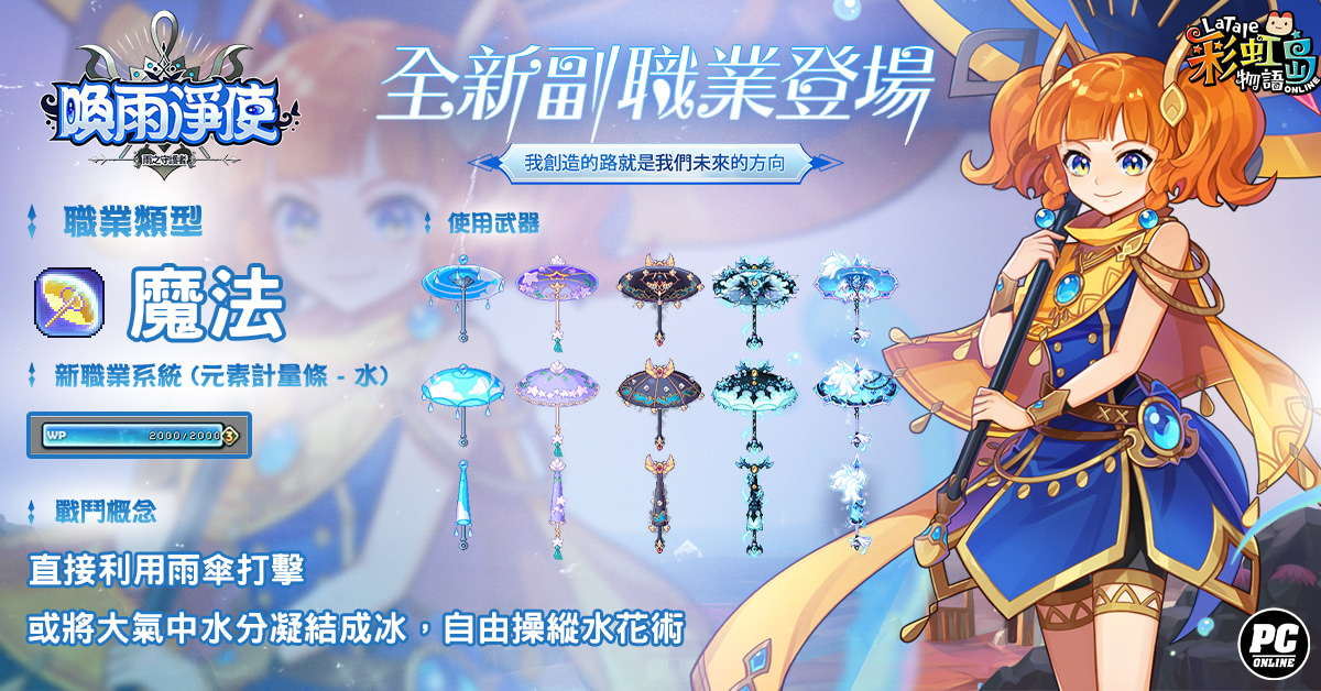 樂意傳播代理之可愛風格線上遊戲《彩虹島物語》繼上次「御風引者」改版之後,今(18)日再次迎接同樣運用自然元素,藉此展現守護人們意志的全新副職業,透過水之精靈的力量洗淨黑暗侵擾的「喚雨淨使」正式開放,同時升等活動「2500!極限燃燒成長超越」也在本週登場,趕緊上線體驗新職業與等級暴升帶來的樂趣吧!