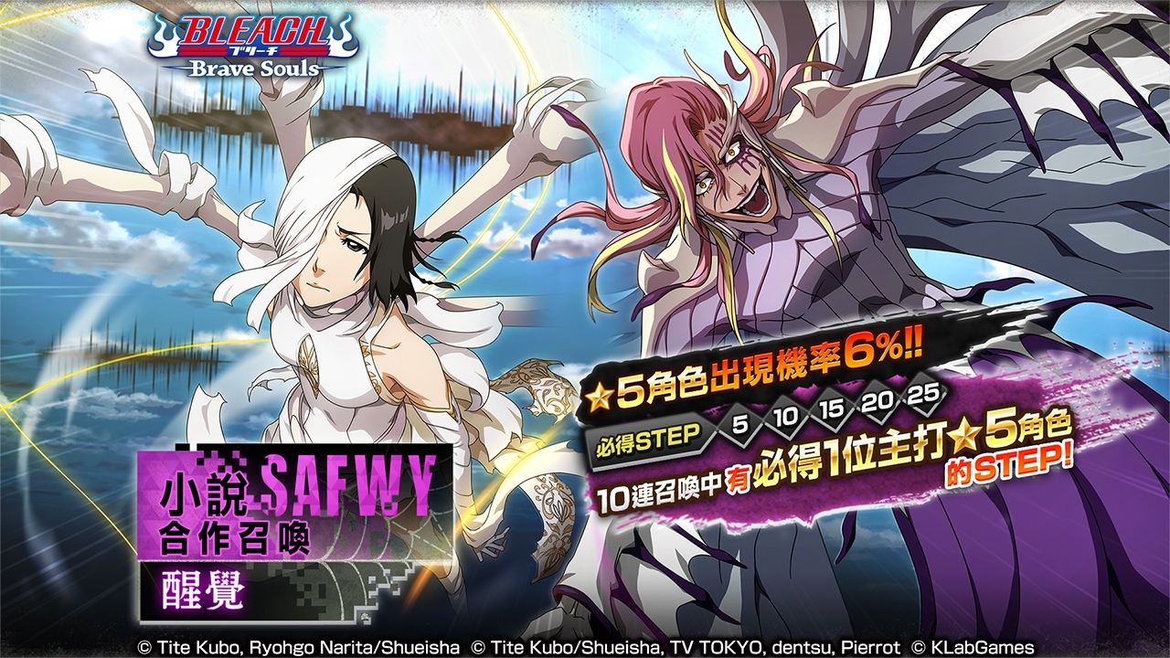 KLab 旗下對應PC、智慧型裝置、PS4 的爽快 3D 動作遊戲《BLEACH:Brave Souls》(以下稱《Brave Souls》)宣布,自日本時間 8 月 31 日(三)16:00(預定)起推出「小說SAFWY合作召喚~醒覺~」。此外,必得 1 位★5 小說合作角色的「免費小說合作紀念召喚」也同時登場。