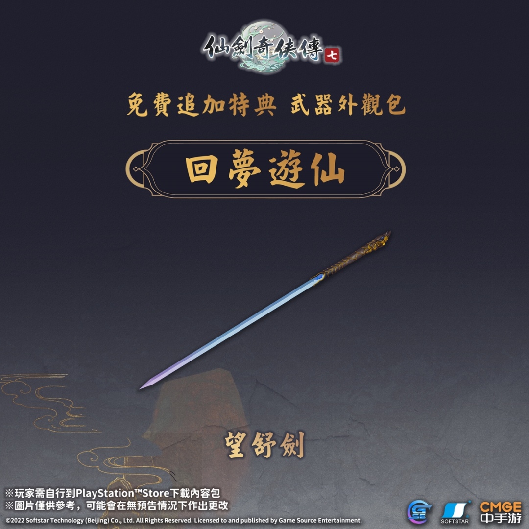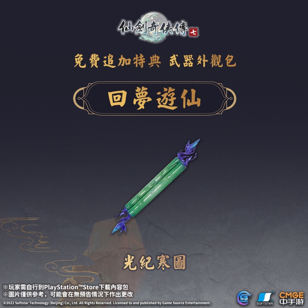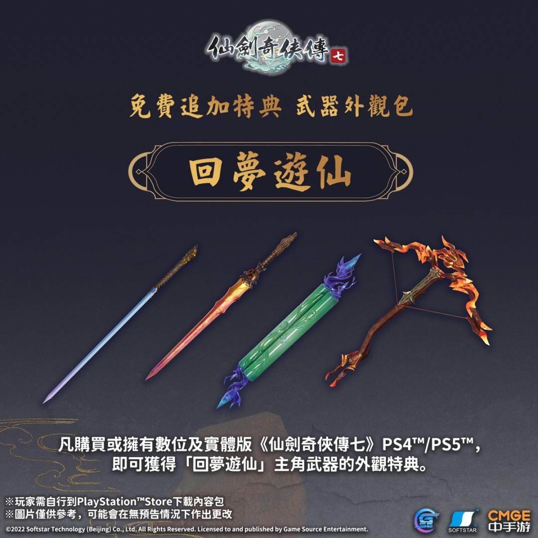 Game Source Entertainment(GSE)宣佈,《仙劍奇俠傳七》PS4/PS5 版已正式上線,相信玩家們已經展開了屬於自己的冒險之旅!而《仙劍奇俠傳七》的開發團隊亦為各位玩家帶來兩大好消息,分別是 《仙劍奇俠傳七遊戲原聲帶》(共 79 曲)和以《仙劍奇俠傳四》為主題的「回夢遊仙」—主角武器的外觀特典,均在 9 月 3 日下午 3 時正正式於 PlayStation Store 上架。各位玩家可以購買遊戲原聲帶及自行到 PlayStation Store 免費下載武器外觀,邊收聽扣人心弦的歌曲,邊重溫《仙劍四》的經典風格。
