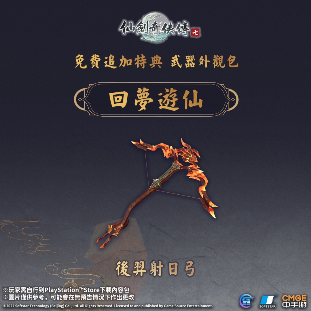 以《仙劍奇俠傳四》為主題的主角武器外觀特典「回夢遊仙」中,包括《仙劍奇俠傳七》四位主角專屬的特色武器外觀:月清疏武器外觀「望舒」、修吾武器外觀「羲和」、白茉晴武器外觀「光紀寒圖」以及桑遊武器外觀「後羿射日弓」。