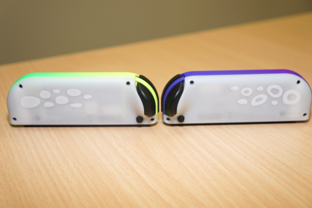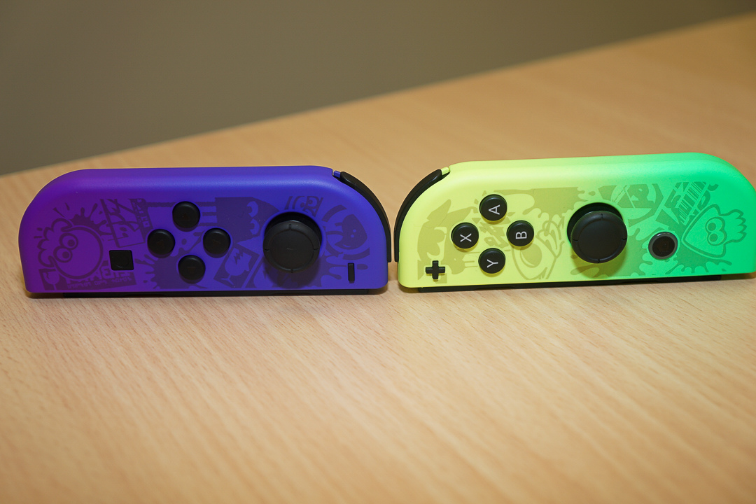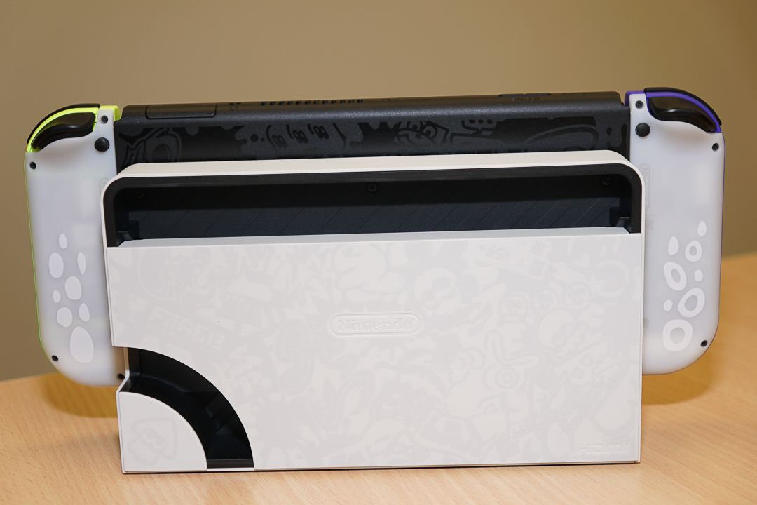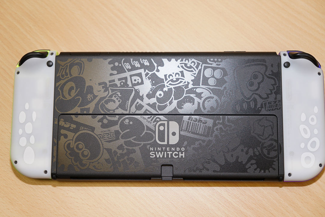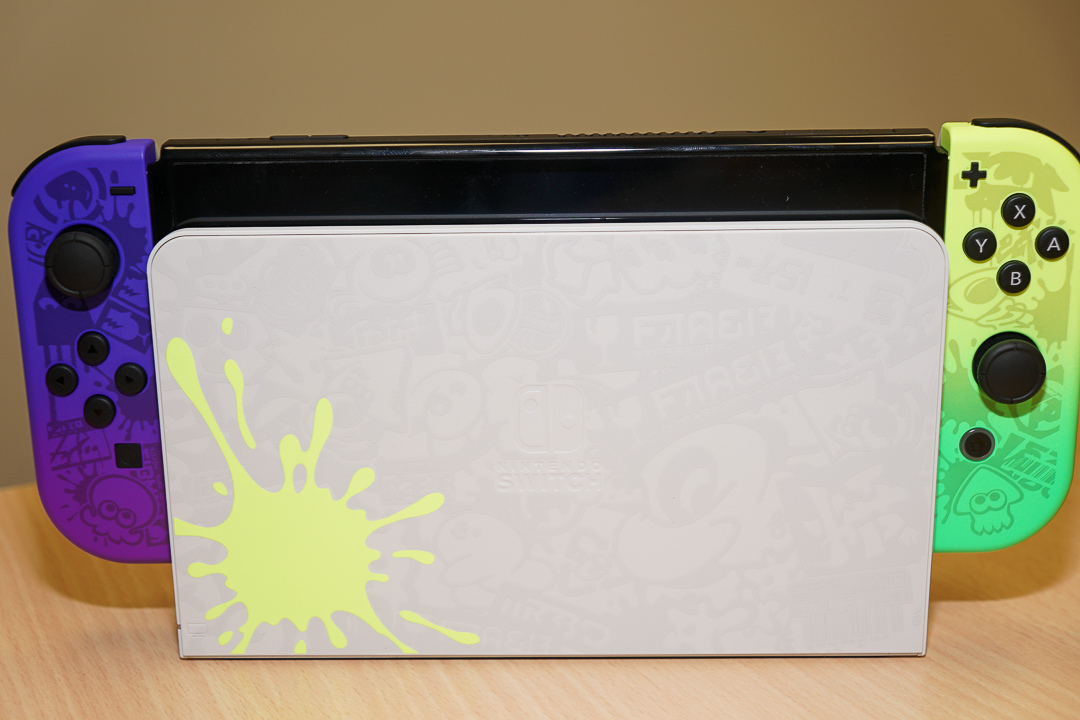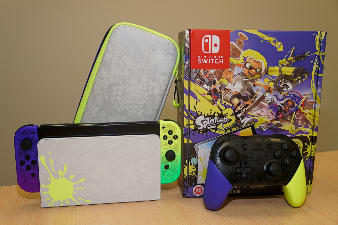 任天堂也同步提供了在遊戲本體發售前,已經陸續於各大通路發售的特別版主機,色彩鮮艷的《斯普拉遁 3》搭配 OLED 的鮮明度,作為特別版主機的設計上,也是運用遊戲世界觀的魷魚、章魚陣營對決,融合本作的兩大黃綠、藍紫色系搭配,在 Joy Con 的背面還可以看到明顯的魷魚與章魚吸盤的花紋,也體現在機身與 DOCK 、保護套的的紋樣設計,可說是魷味十足,如果是系列粉絲還在使用舊型主機主機的,這款主機與控制器都是相當適合的選擇。