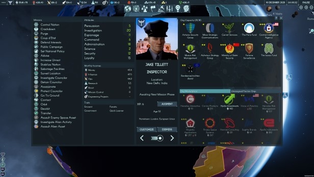 陣營會透過他們的政治家、科學家與情報人員來運作,當陣營的影響力越大時,這些人員的能量也會跟著增加;遊戲中的科研系統模擬了跨國界科研中的機會和挑戰,像是與民間分享軍事研究的最新成果會解鎖不少私營工程,但是私營工程的規模越大,科研成果被其他陣營或者外星人竊取的風險也越大,考慮到風險與收益的同時有必要選擇科研的重點。