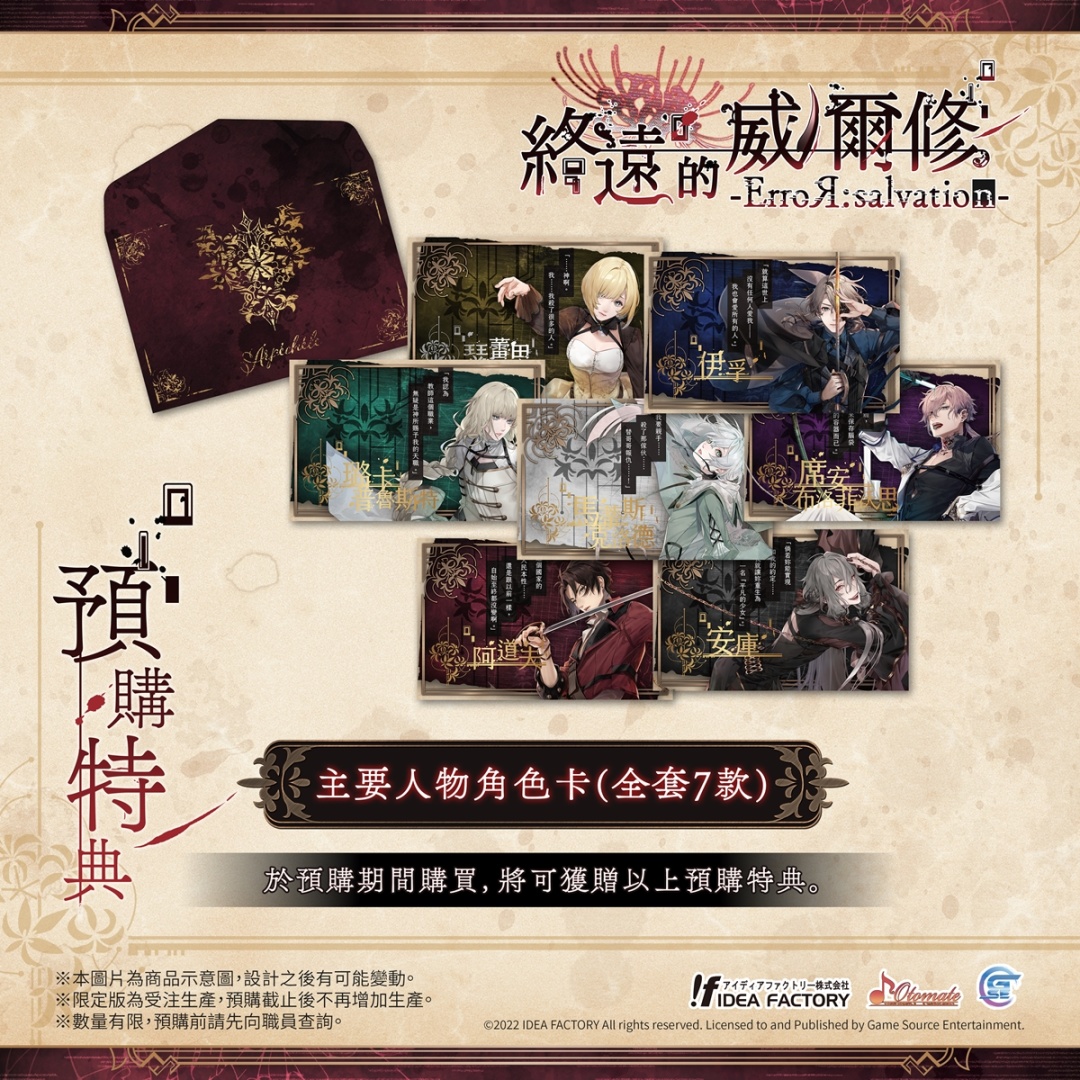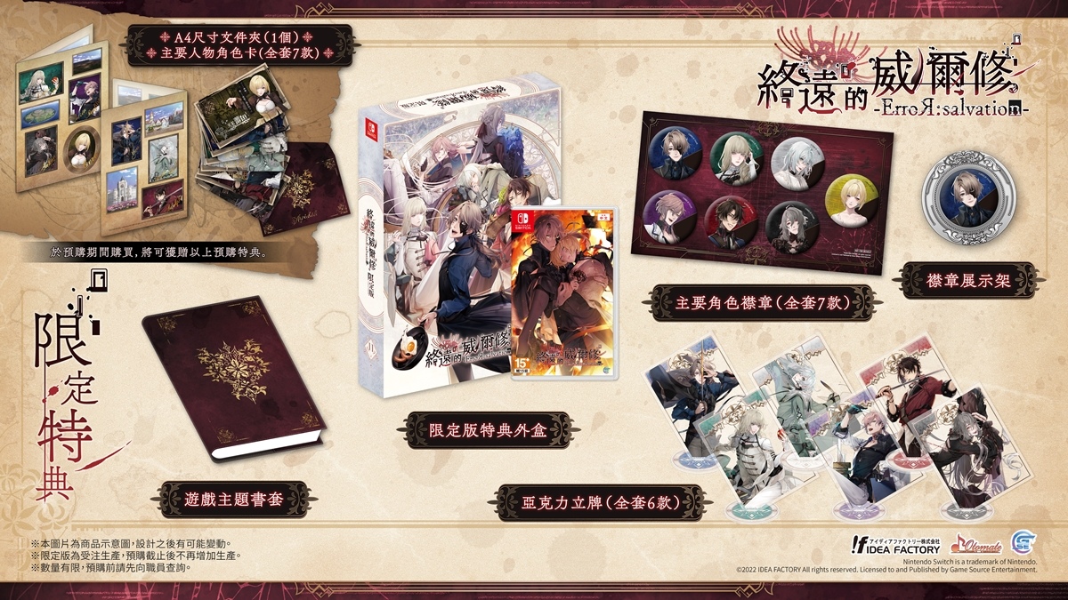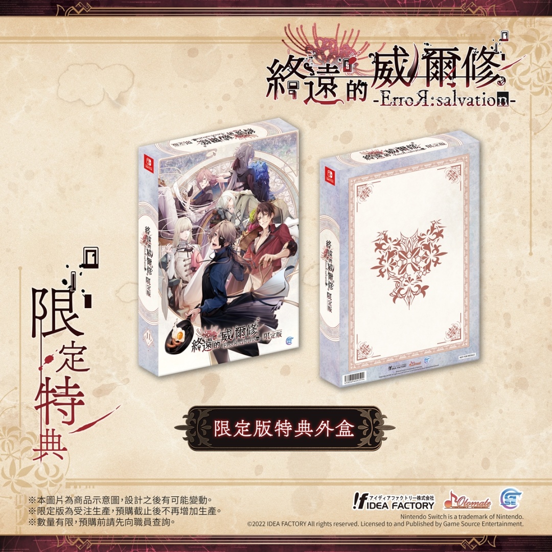 Game Source Entertainment(GSE)宣佈,再次與著名日本遊戲公司「Idea Factory」旗下乙女遊戲品牌「Otomate」合作,推出人氣乙女遊戲新作《終遠的威爾修 -ErroR:salvation-》Nintendo Switch 亞洲繁體中文版,預計於 2022 年內正式與各位玩家見面。今天將為大家公開《終遠的威爾修 -ErroR:salvation-》的預購及限定特典。