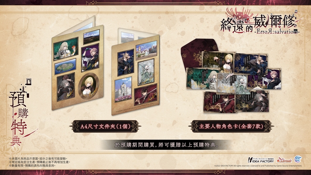 凡由即日起預訂《終遠的威爾修 -ErroR:salvation-》Nintendo Switch 亞洲繁體中文版的玩家,將獲得豐富精美的預購和限量版特典!