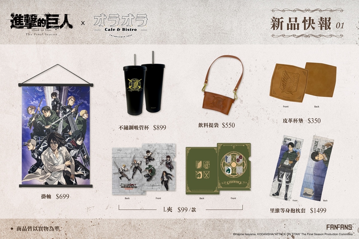 「歐拉歐拉オラオラ」和「FANFANS 粉粉」獨家合作,設計出獨特風格的全新週邊,像是超有質感的黑色不鏽鋼杯、皮革杯墊、飲料杯套,還有收藏欣賞的壓克力立牌、掛軸。另外,喜歡里維的粉絲絕對不能錯過「里維等身抱枕套」,讓兵長陪伴你度過每一天。全系列周邊也將同步於「FANFANS 粉粉」官網上架,千萬別錯過收藏機會。