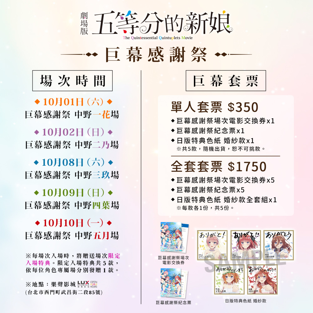 10/1(六)起,《劇場版 五等分的新娘》巨幕感謝祭,將由「中野一花場」揭開序幕,10/2 則舉辦「中野二乃場」,10/8、10/9、10/10 分別為「中野三玖場」、「中野四葉場」、「中野五月場」。購買單人套票 350 元,即可擁有「巨幕感謝祭場次電影交換券一張」、「巨幕感謝祭紀念票一張」,「日版特典色紙 婚紗款一張(共五款,隨機出貨)」;全套套票 1750 元,包含「巨幕感謝祭場次電影交換券五張」、「巨幕感謝祭紀念票五張」、「日版特典色紙 婚紗款全套組一份(每款各一份,共五份)」。
