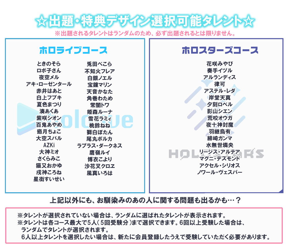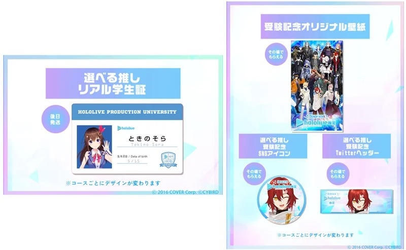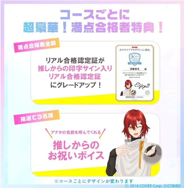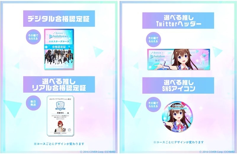 每個申請檢定的人都會收到一張「Hololive Production 大學學生證」,還可以下載 SNS 頭像、推特封面照片、紀念桌布等特典,而學生證、頭像與封面照片可以選擇自己最推的成員;若測驗合格將會收到實體和數位各一份的合格證書,上面不僅會印上參加者的名字,也會有最推成員的照片,此外得到滿分的人,合格證書會升級成帶有複製簽名的實體合格證書,並抽出三名幸運的滿分合格者,贈送收錄合格者名字的聲音留言(可選擇想要的成員)。