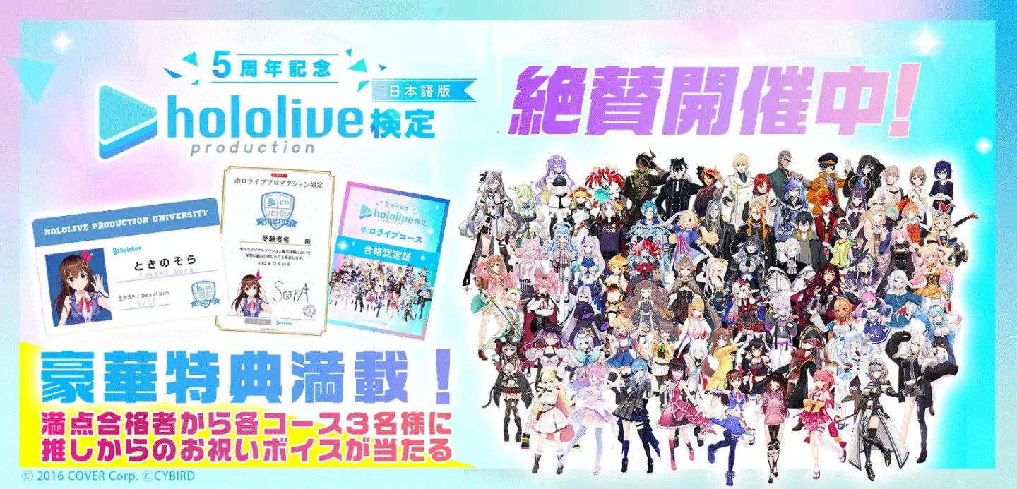 日本線上檢定網站「CYBIRD」今(28)日宣布,為慶祝人氣虛擬偶像事務所「Hololive Production」成立五周年,兩家公司的合作企劃「Hololive Production 檢定」(日文版)即日起正式開始。