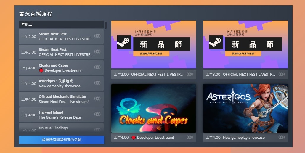 活動頁面上也提供了各個開發團隊的實況時程以及 VOD 供玩家觀看