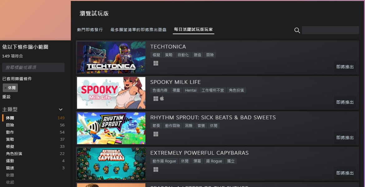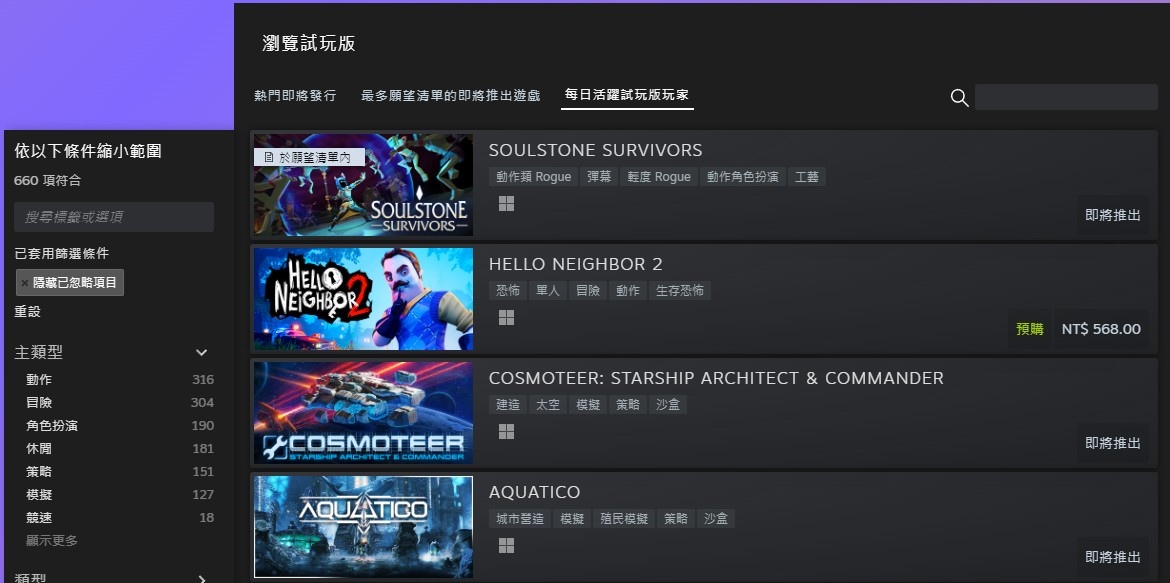 新品節將舉辦至 10 月 10 日,以即將發行、最多願望清單、每日活躍試玩人數三種排行方式,可依據左側的分類標籤來自行尋找有興趣的作品。除了試玩外若對於作品或是開發團隊有興趣,也可關注頁面上的直播和 VOD 紀錄,查看更多趣味內容。