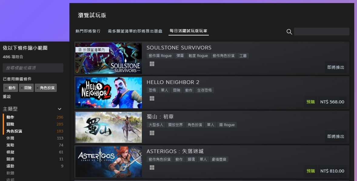也可一次選定多個類型來查看含有這些要素的試玩作品