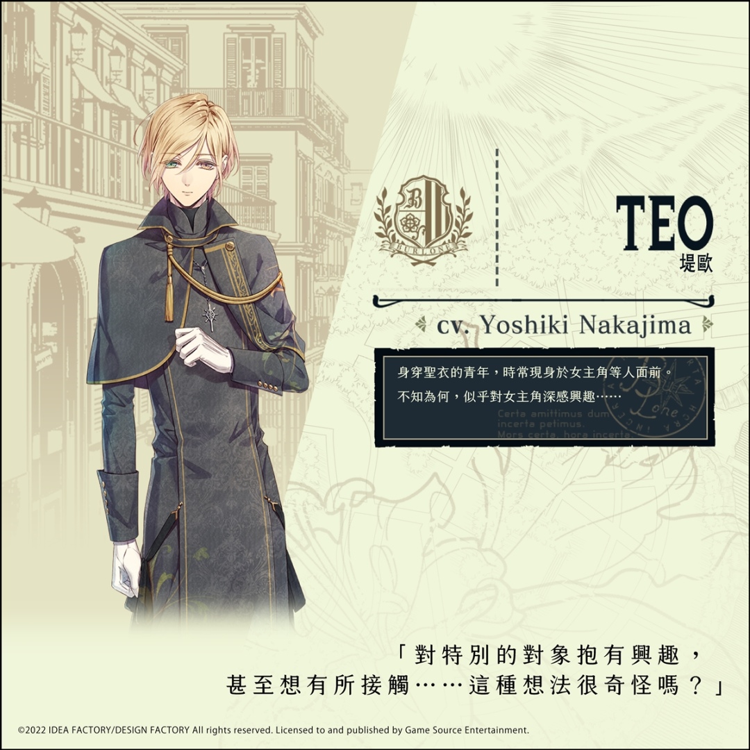 由 Game Source Entertainment(GSE)與著名日本遊戲公司「Idea Factory」旗下的乙女遊戲品牌「Otomate」合作發行的人氣乙女遊戲續作《虔誠之花的晚鐘-1926-》繁體中文版,即將於 2022 年 12 月 12 日在 Nintendo Switch 上與各位玩家見面。今天將為大家介紹遊戲中最後 7 個配角的基本情報。