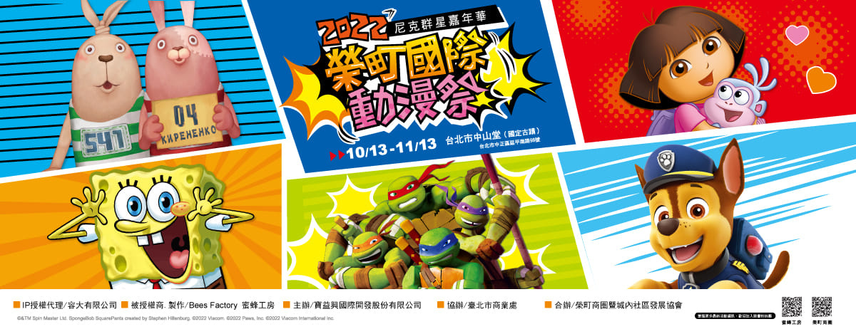 「2022 台北榮町國際動漫祭親子商圈嘉年華」與國際 IP 授權公司合作的《汪汪隊立大功》遊戲區、快閃店、卡通明星見面會等都是大小朋友、粉絲們所期待的!除了《汪汪隊》的阿奇、毛毛,還有海綿寶寶、派大星,小朋友最愛的冒險夥伴 DORA 朵拉,還有《逃亡兔》綠兔、紅兔人偶,都將現身現場與大家一起同樂!