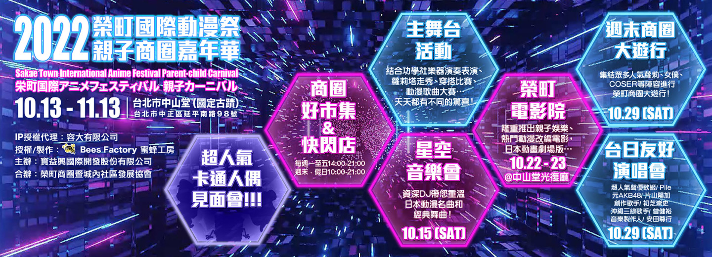 台北「榮町」在日治時期,是當時台北最繁華的區域,因而有「台北銀座」之稱。由寶益興國際發展股份有限公司主辦,台北市政府商業處與榮町商圈暨城內社區發展協會協辦的「2022 台北榮町國際動漫祭親子商圈嘉年華」,以日式建築古蹟中山堂作為本次活動地點,現場以歡樂新奇及輕鬆好玩的活動規劃為主軸,與國際 IP 授權公司合作親子遊戲區、人偶見面會,音樂表演、動畫歌唱大賽、蘿莉塔時尚走秀及各種攤位登場,讓民眾帶著親朋好友們來認識「榮町」,享受愉快的活動。為期一個月的「2022 台北榮町國際動漫祭親子商圈嘉年華」活動將於 10 月 13 日(四)下午兩點正式開幕!