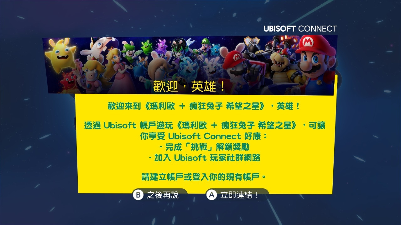 在遊戲一開始,系統會先親切詢問玩家是否要登入或建立 Ubisoft 帳號,讓玩家可以透過完成挑戰解鎖獎勵獲得額外的 Ubisoft Connect 好康,玩家可自由決定是否要立刻連結。不過基於有好處不拿對不起自己的原則,基本上當然還是會建議玩家立刻連結啦!