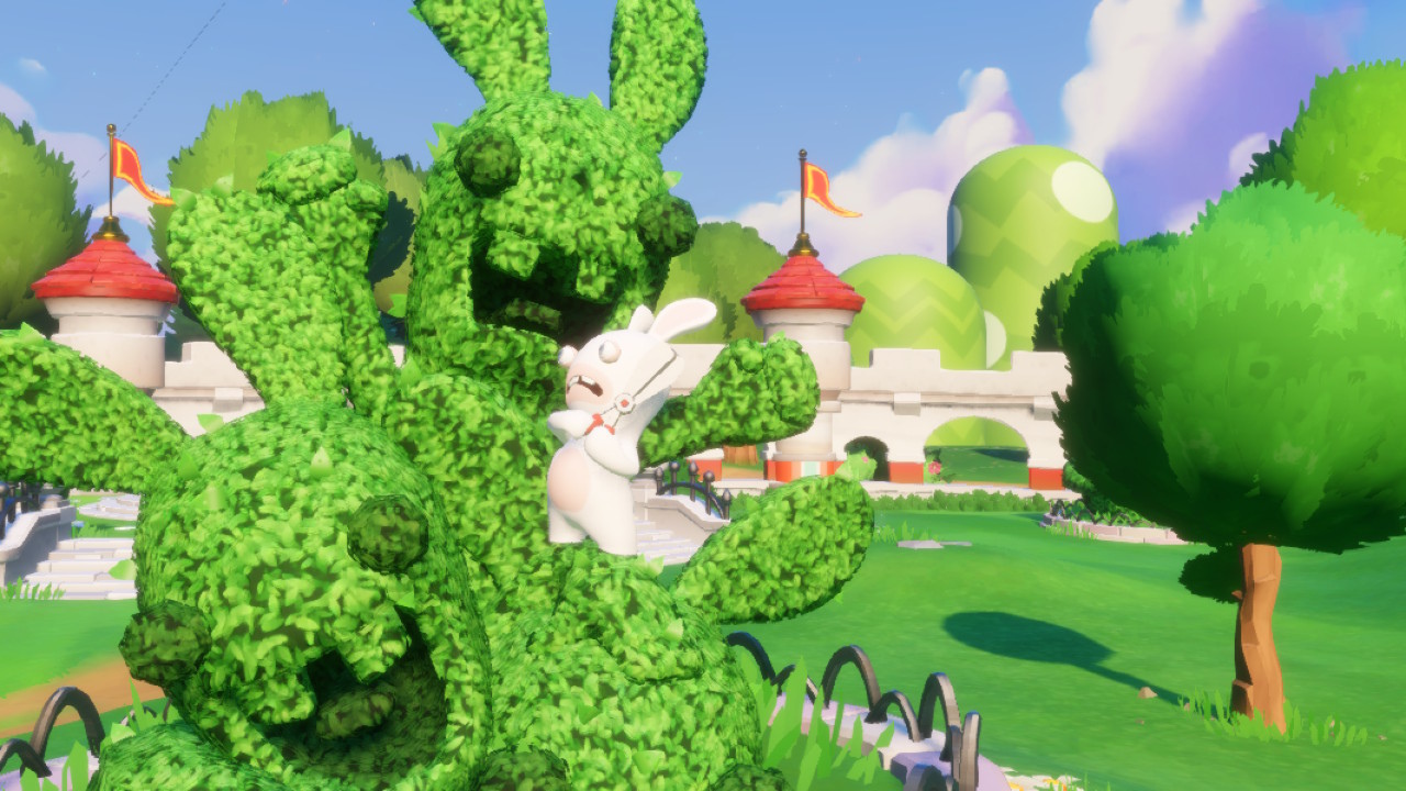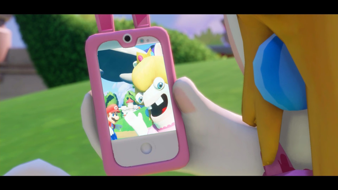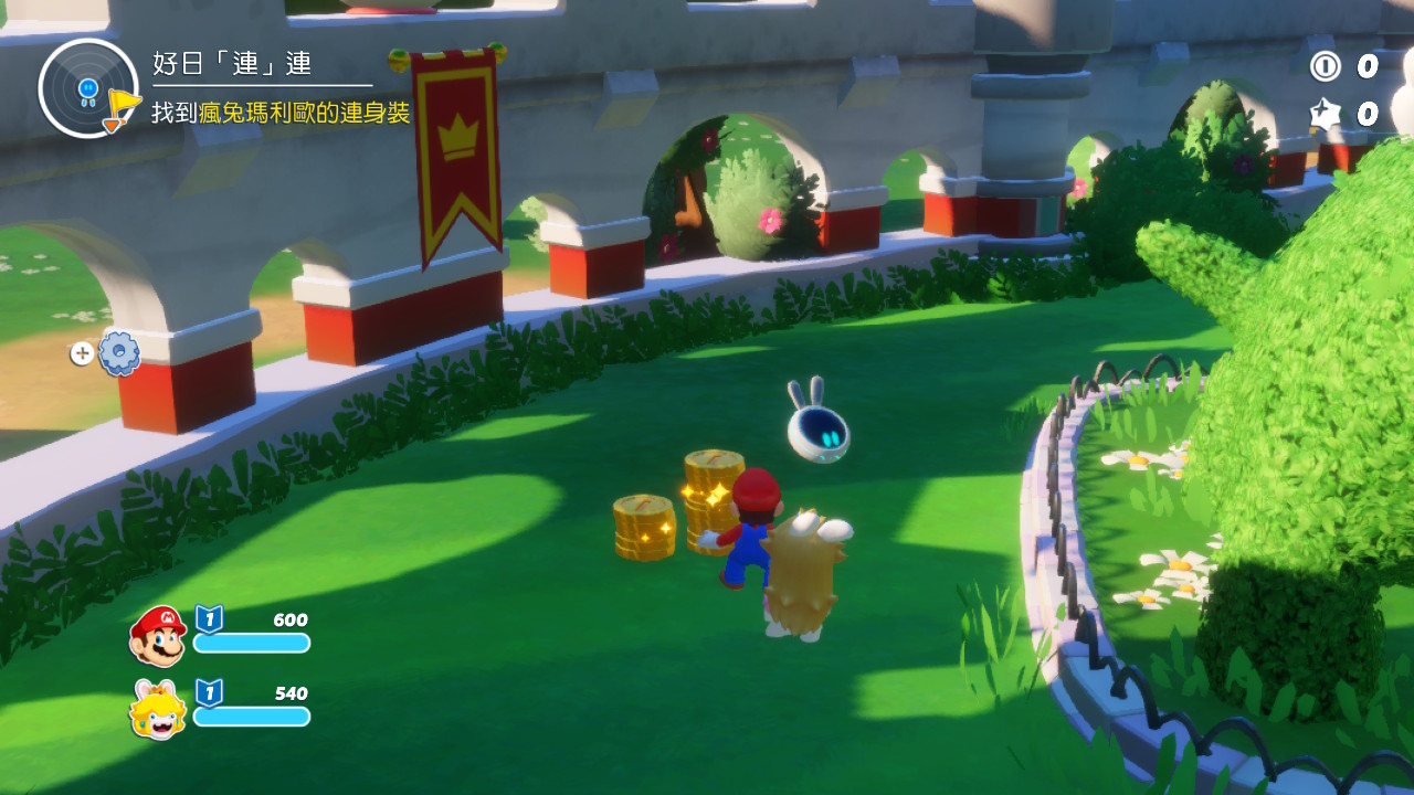 而在進入遊戲後,玩家可以看到和平的王國,還有熟悉的碧姬公主、瘋兔碧姬公主、Beep-Q 等角色登場。而瘋兔瑪利歐則是因為瘋兔路易吉的惡作劇而失去連身服,只好拜託正版的瑪利歐來幫忙找回自己的連身裝。玩家也可以藉著這個機會,先來熟悉遊戲中的動作操作與探索,並與庭院裡的 NPC 們交談,熟悉遊戲內的基本操作。