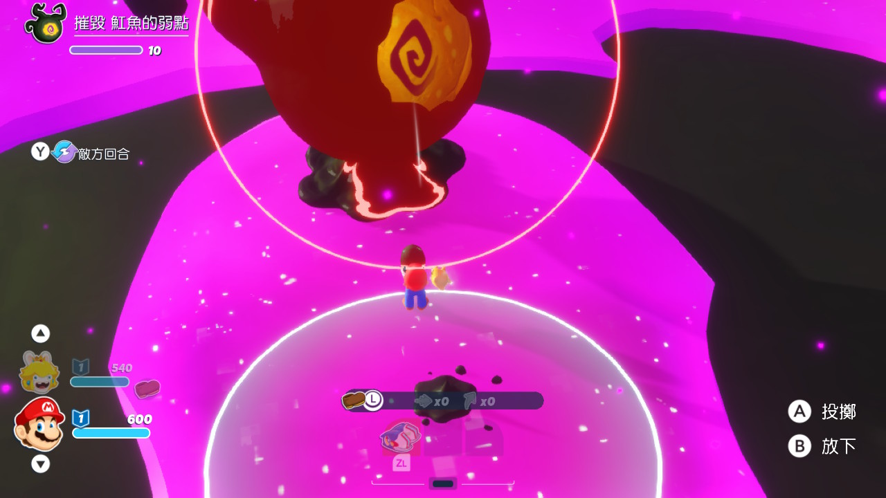 在教導玩家熟悉玩第一次的基本戰鬥操作後,接下來就是巨大魟魚怪物的決鬥,而瘋兔碧姬公主也會正式加入戰鬥成為玩家的夥伴。相較於一般 SRPG 對戰,本作的戰鬥會有更多元不一樣的玩法操作,玩家也可以藉由第二輪的戰鬥,來熟悉更多的動作操作玩法,例如像是可以將場上物件撞鬆的衝刺、舉起場上物件投擲敵人的投擲動作、或是讓夥伴們站在一起,藉此來跨越障礙進行遠距離跳躍移動的隊伍跳躍等夥伴協力合作要素!