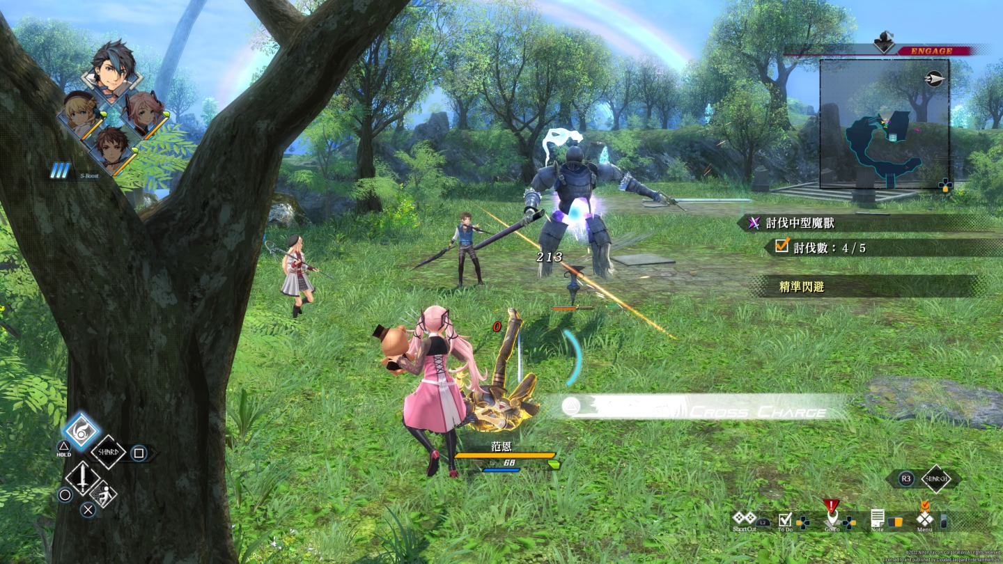 「交錯蓄力攻擊」則可以看到來自近代《伊蘇》的影響,瞬間迴避後可以自動切換角色追加蓄力攻擊,加上快捷魔法,因此戰鬥流程從原本的「普攻→蓄力攻擊→擊暈」多了「普攻/快捷魔法→閃避→交錯蓄力攻擊」然後在敵人暈眩時切入指令戰鬥。也讓原野上的隊伍成員除了 AI 控制的攻擊節奏外,多了讓玩家可以自主施放的機會,戰鬥手腕也更加豐富。