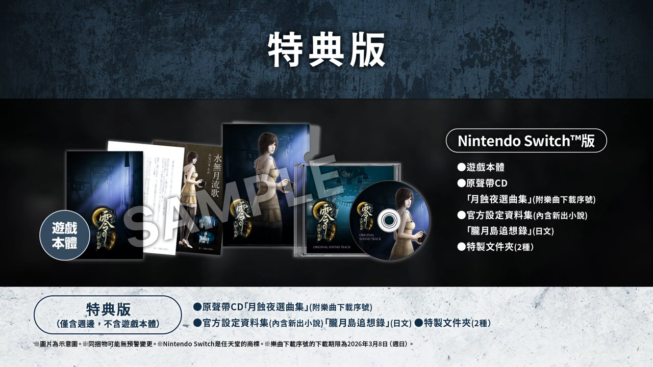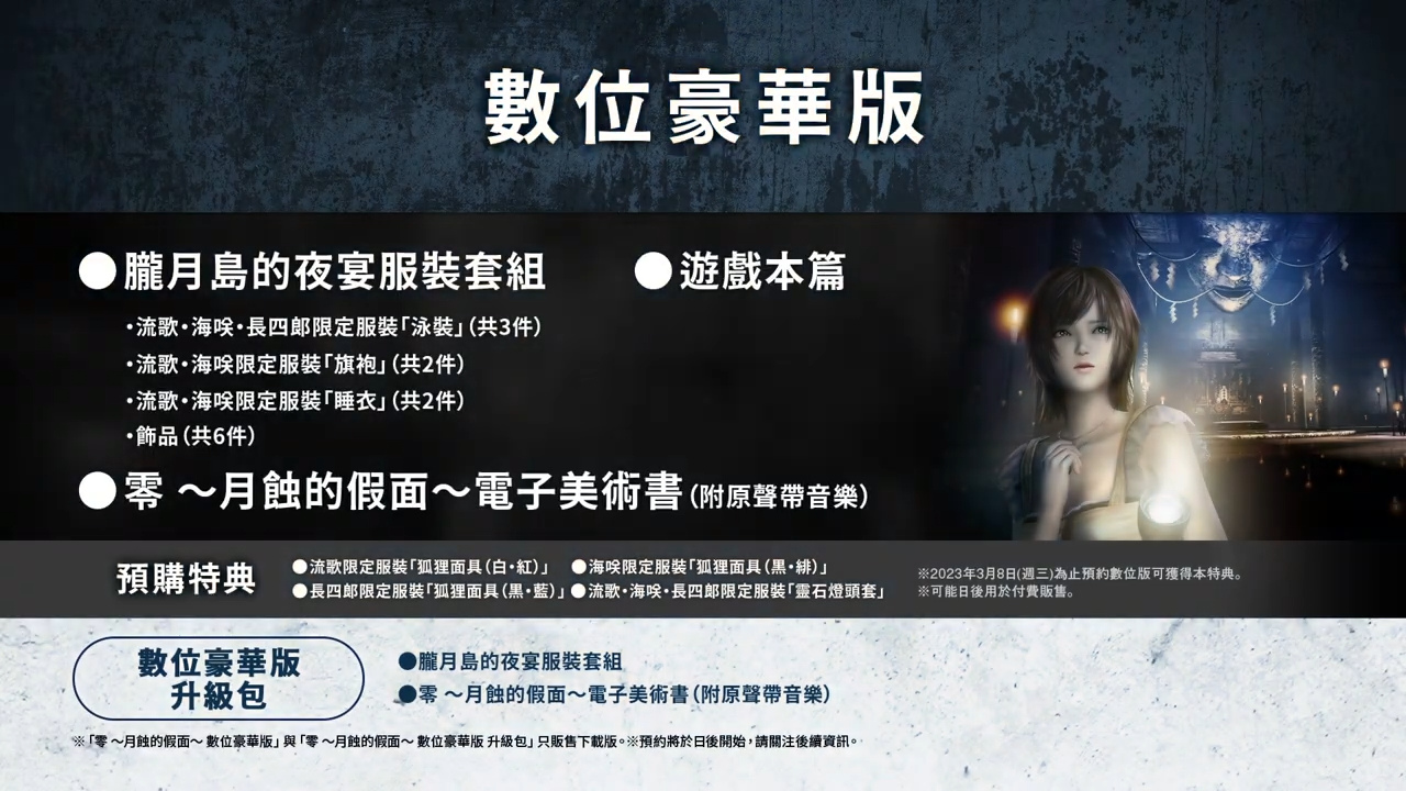 隨著《零 ~月蝕的假面~》確定發售日,數位版、實體版今起開放預購,Nintendo Switch 更將發售可單獨購買的特典版。