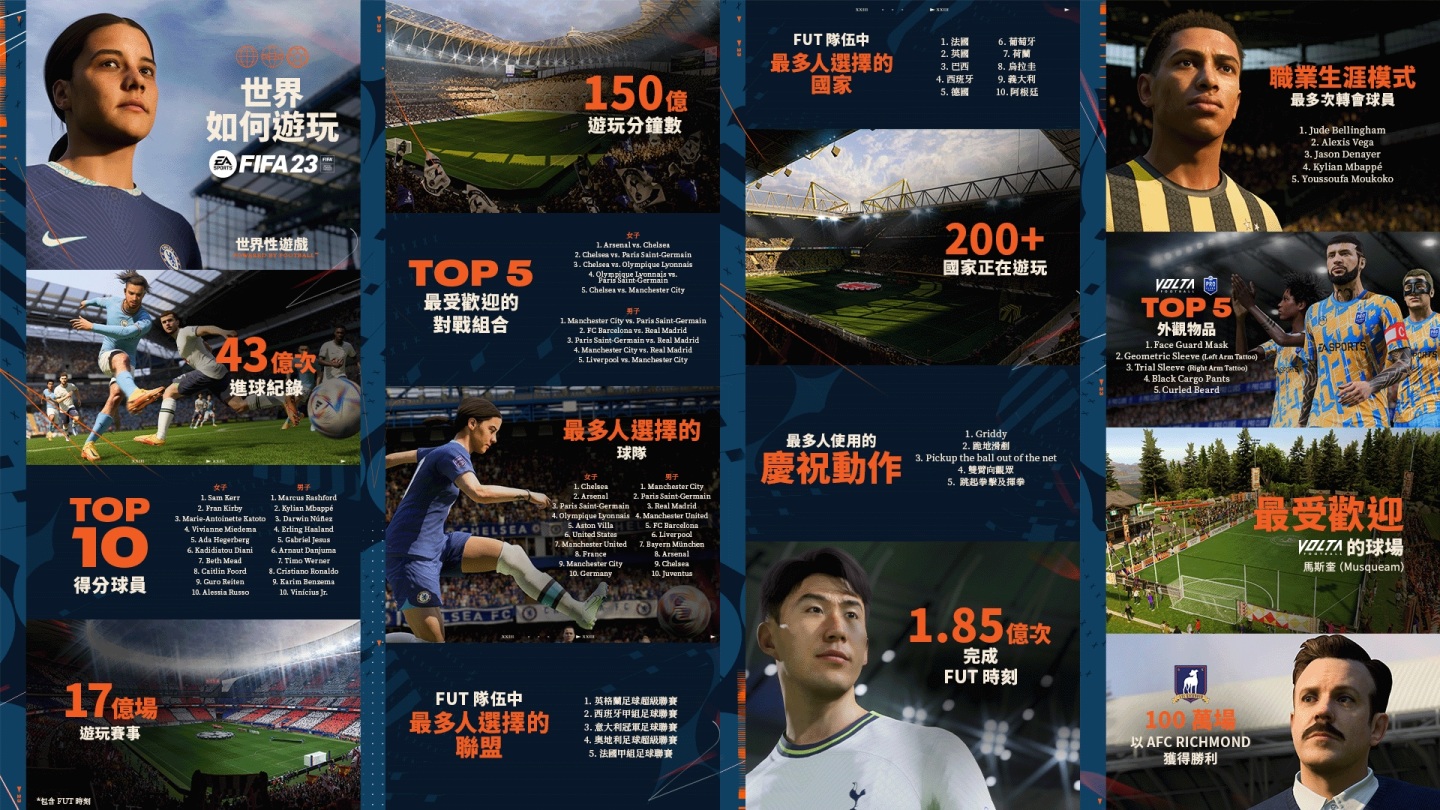 美商藝電公司歡慶 EA Sports《FIFA 23》全球發行後 23 天,玩家參與度成績斐然。《FIFA 23》在推出首週便打破紀錄,吸引了超過 1,030 萬名玩家,締造 EA Sports《FIFA》系列前所未有的上市盛況。截至今日,遊玩過這款年度之作的玩家已遍布 200 多個國家。已遊玩賽事男女總計突破 17 億場(含 FUT 時刻),同時還創下逾 43 億次進球紀錄。玩家整體遊玩時數超過 157 億分鐘~大約相當於 30,000 年。