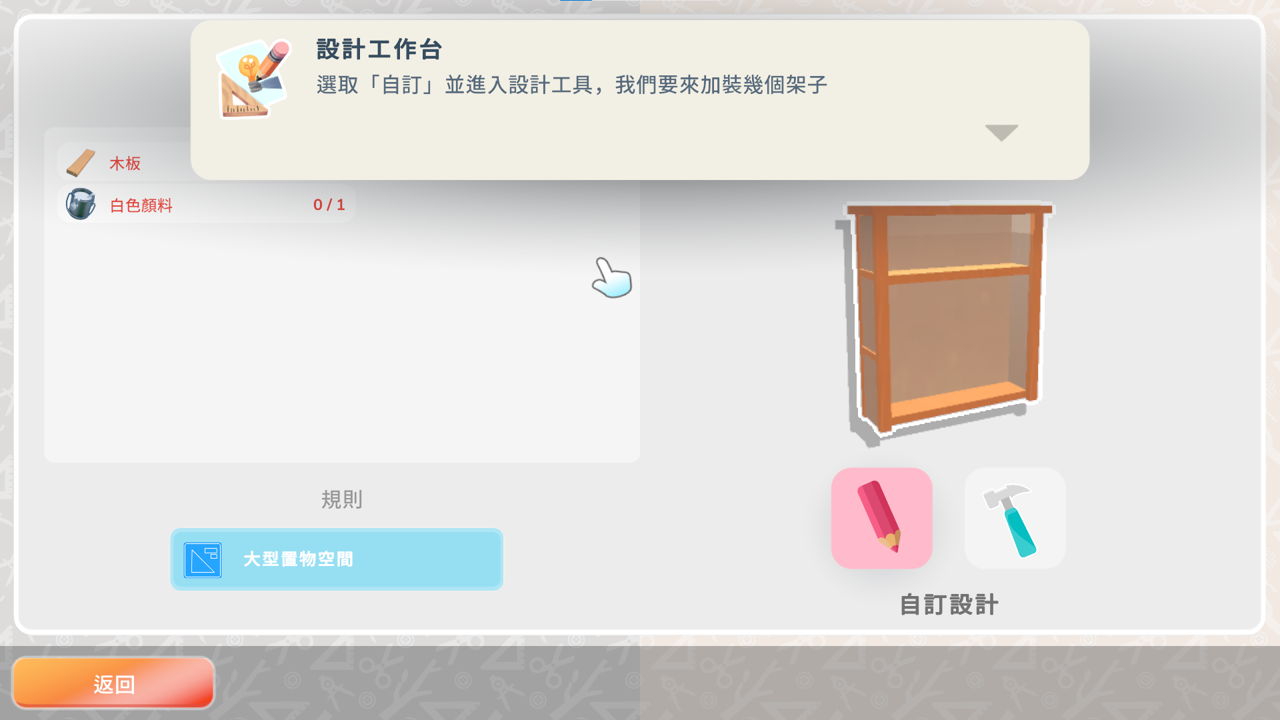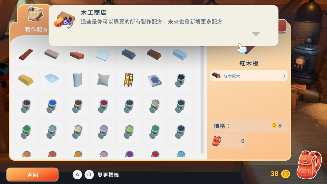 你可以在這裏加工所有設計用的材料,例如布製品、金銀銅、磚塊、木板、顏料、布染料等,只要收集到右方欄目寫著的指定原材料,便能製作出素材來完成您的設計!除了到鎮上的森林和礦山收集原料,您還可以到摩斯的商店購買種子、膠水、布染料基質等常用的材料。