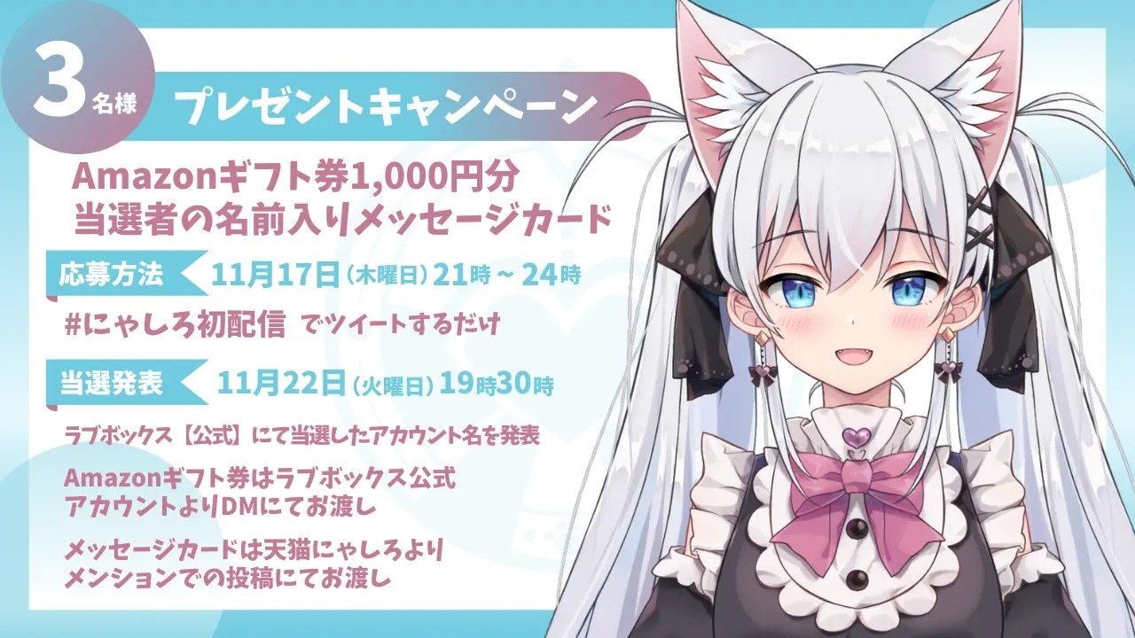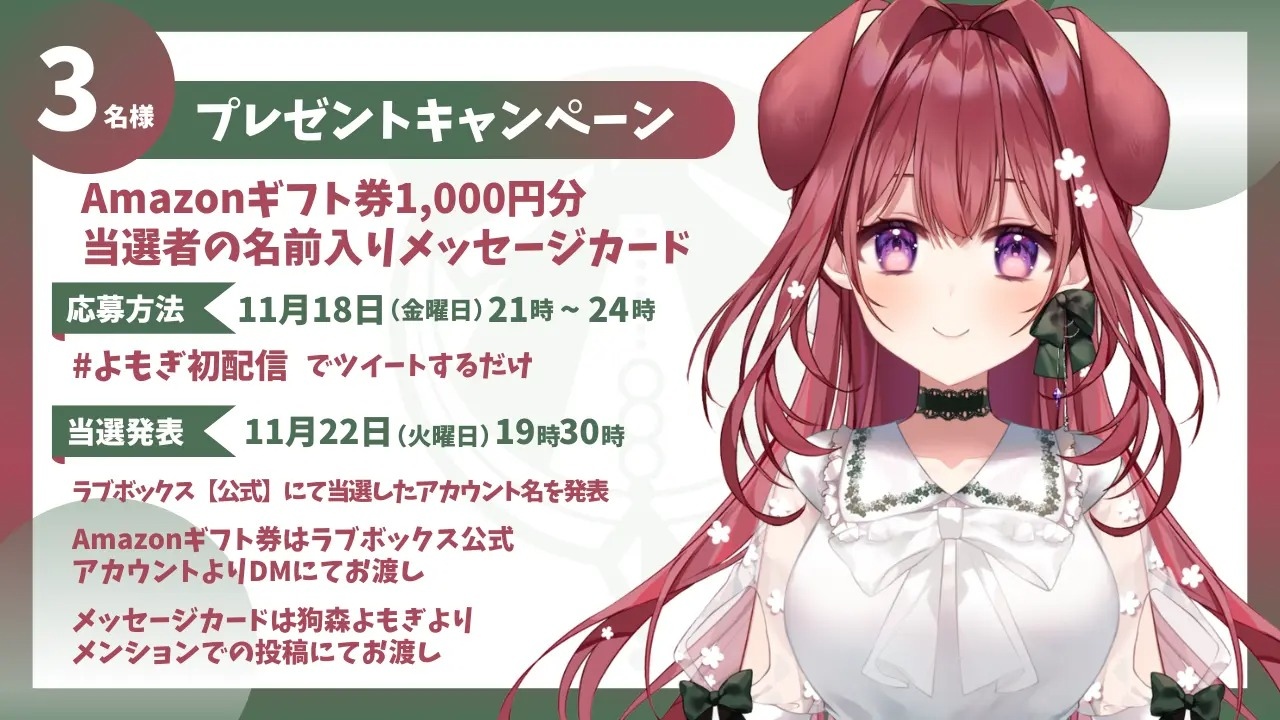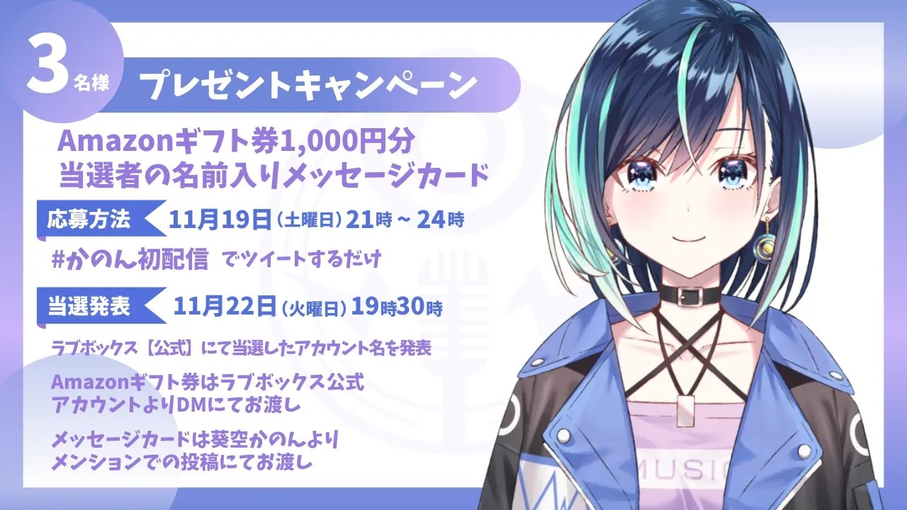 為慶祝四名成員搶先出道,LoVebox 將舉辦抽獎活動,在每位成員進行初配信的時段,到推特上發文並附上成員們個別的關鍵字,官方就會在 11 月 22 日公布中獎名單,幸運兒將會獲得 Amazon 禮物卷以及附有中獎者名字的卡片,此外成員們的 Pixiv Fanbox 也已經開設,會配合初配信的時段開放申請,對這組團體感興趣的話不妨來看看她們的直播吧!