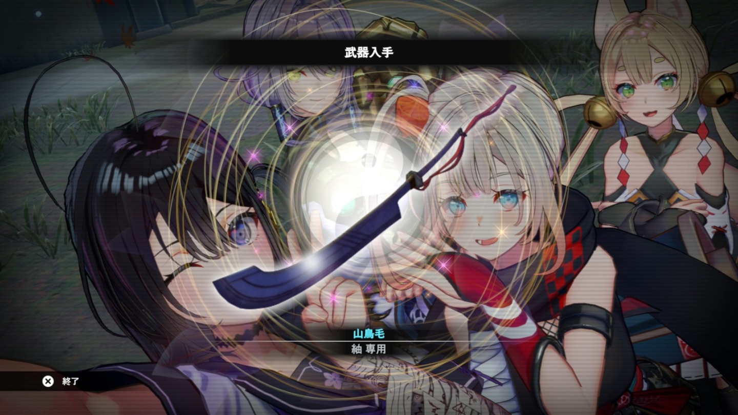 附帶一提,隨著遊戲進行,紬與護影們將可以獲得各式各樣的武器,其中也包括某些需要滿足特定條件才能入手的武器,例如像是有著能夠增加大斬威力、或是對倒地、氣絕狀態的敵人使用大斬時增加傷害量的武器技能的紬的專用刀「山鳥毛」、或是能夠提升迴避攻擊技「殘影」威力、或是讓迴避的無敵時間變長的紬的武器「來國長」(来国長);而在護影們的武器方面,則是有可以增加陷入著火狀態敵人傷害量增加的依夜專用苦無「烈火苦無」等等,玩家可以來多加收集。