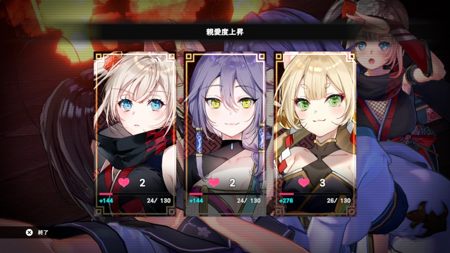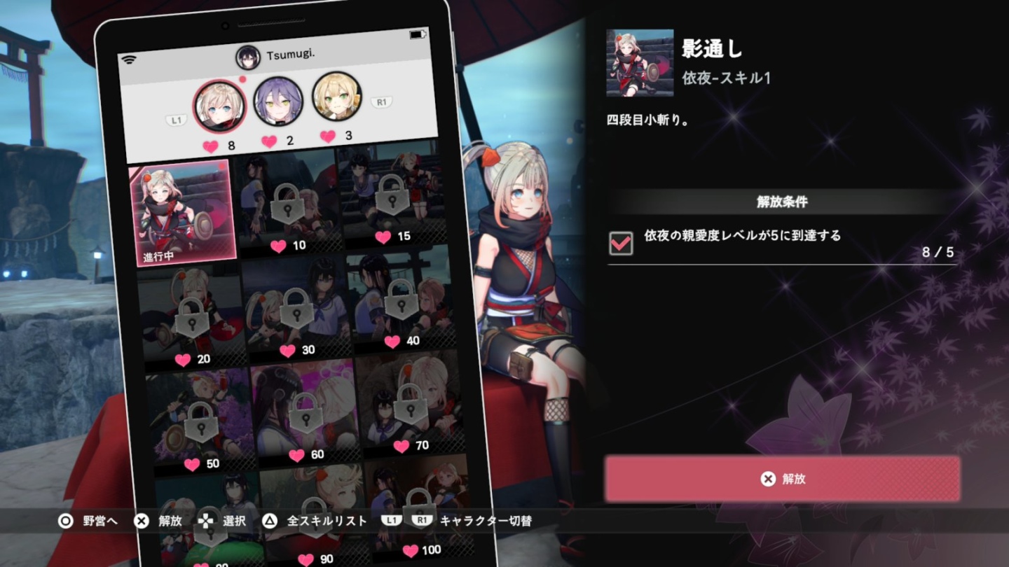而隨著玩家與護影特訓共鬥,彼此的親密度將會不斷提升,另外玩家也可以透過攻略約會事件「泡沫逢瀨」來提升與護影們的親密度。隨著玩家與不同護影進行特訓,將可以藉此製作出不同的回憶相簿,並能藉此來習得不同的技。例如與依夜特訓,可以習得能將周圍敵人一掃而空的「水月」、與刃鋼的特訓,可以學會能從空中落下向敵人展開突擊的多段連續技「雨穿」(雨穿ち)、與狐美魅特訓,則是可以學會反擊等技巧技「後之先」(後の先)。